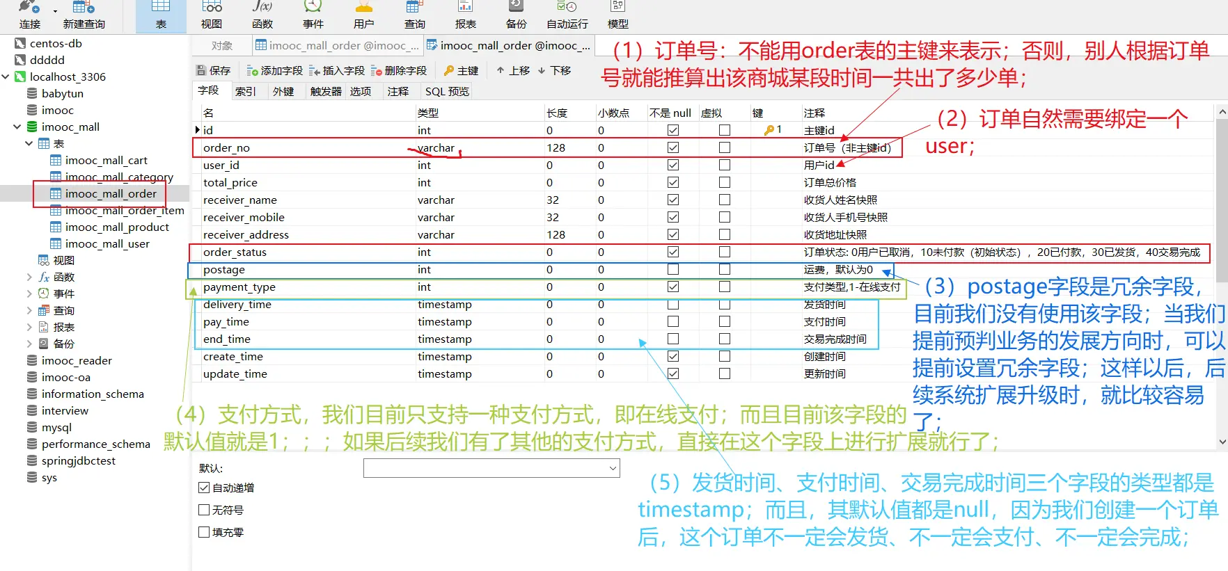 ● 给数据表加上前缀,也可以很好的防止与关键字冲突;;比如order、user这些都是MySQL的关键字,而关键字是保留的、不允许使用的,否则系统就很难判断究竟是用户写的还是系统生成的;所以,这儿给其加上前缀后,imooc_mall_order表名就没有和关键字重名了;