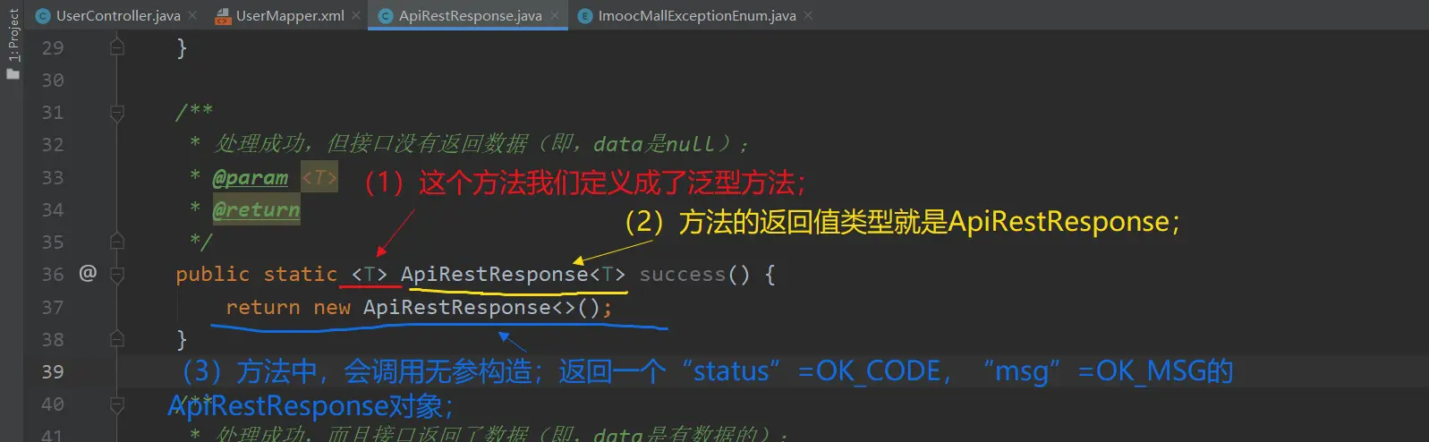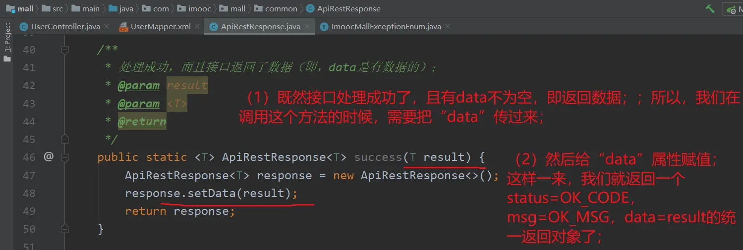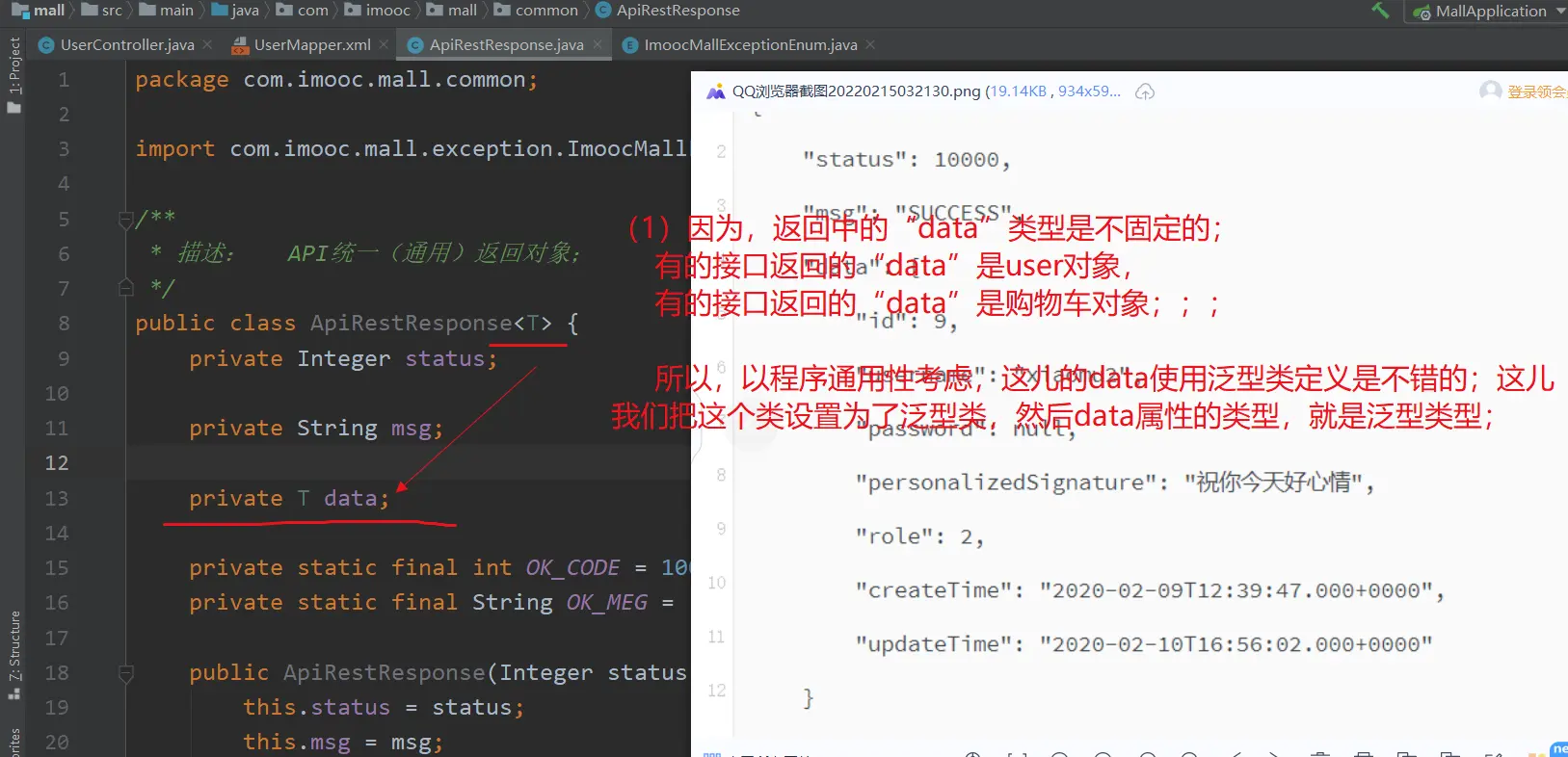 (1) 因为返回中的“data”类型不固定,所以【统一返回对象】类设为了一个泛型类,“data”属性的类型设置为了泛型类型;