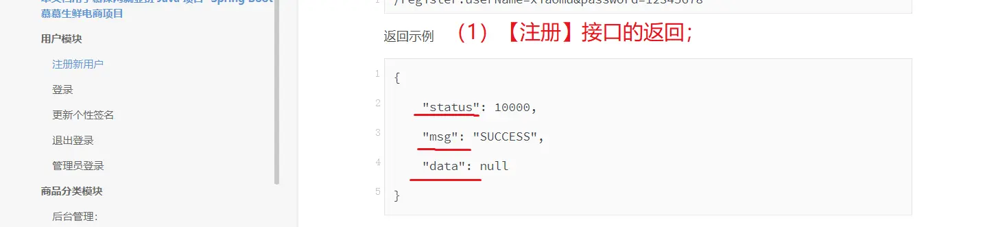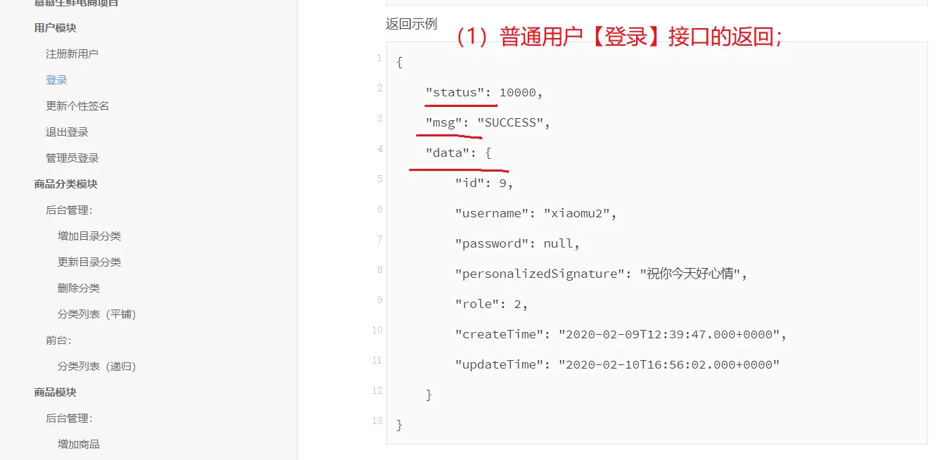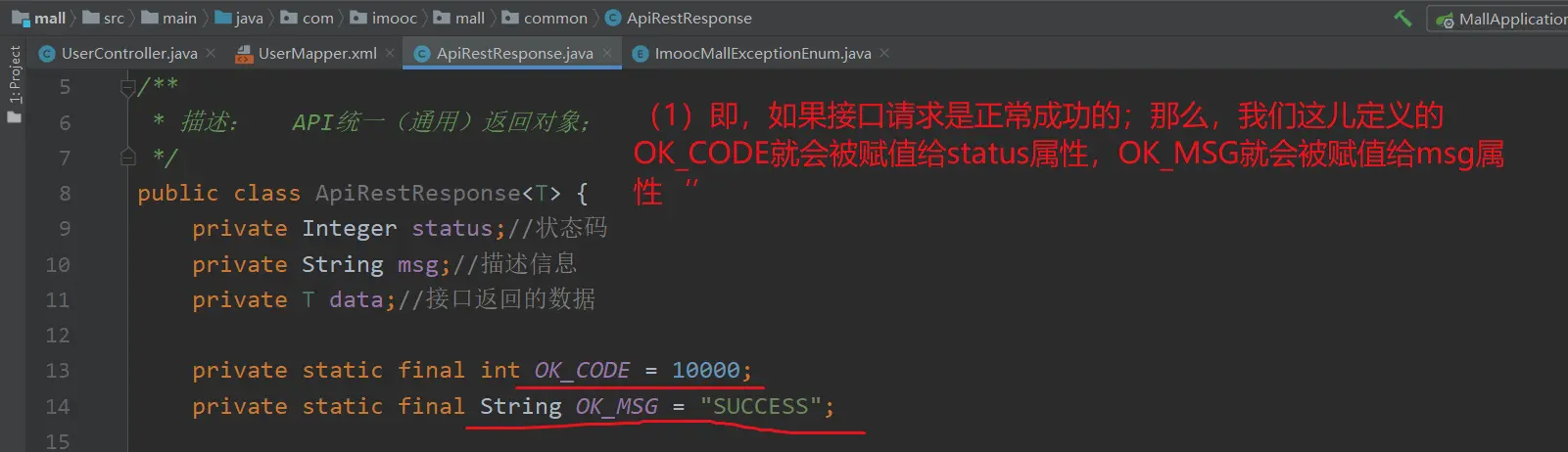(2) 因为,大部分情况下,前端请求接口时,都是成功的;所以,这儿我们就先定义了【请求接口成功时,“status”和“msg”应该有的值】;