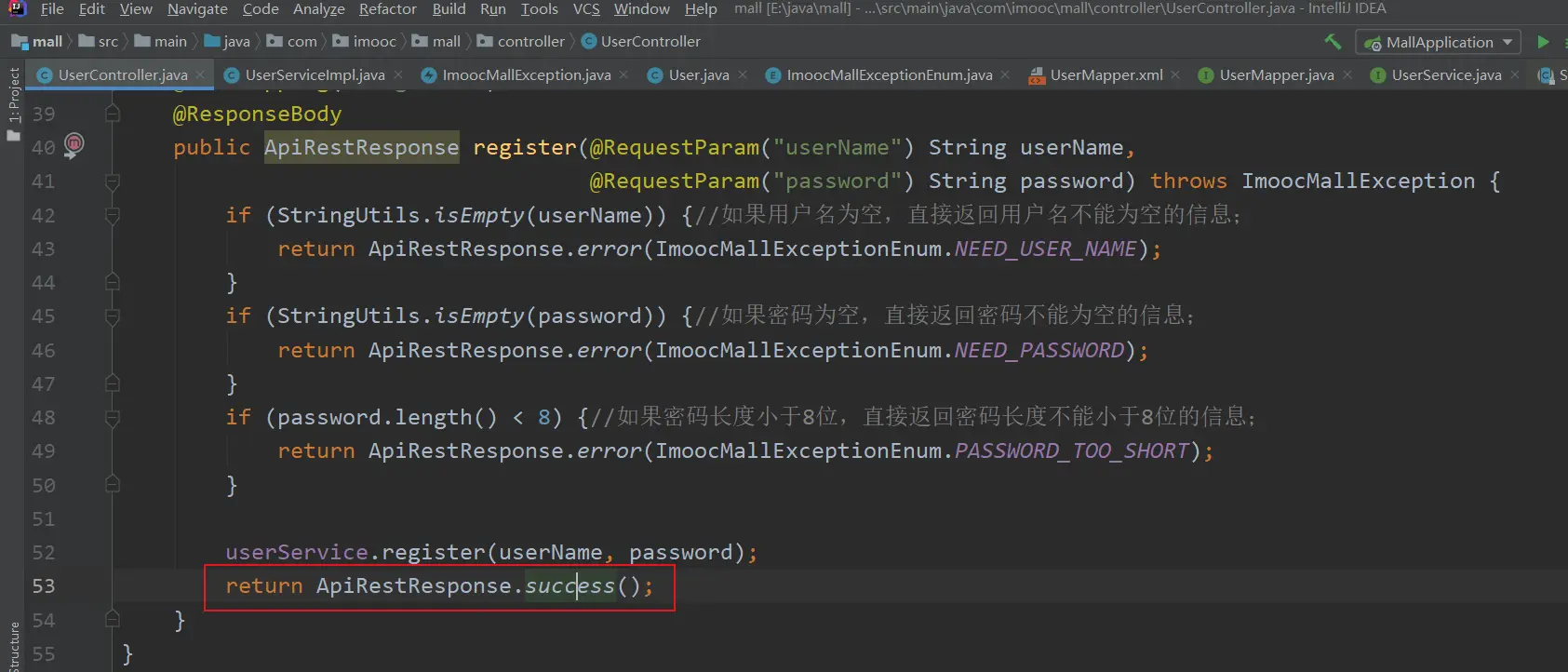 public ApiRestResponse register(@RequestParam("userName") String userName, @RequestParam("password") String password) throws ImoocMallException {