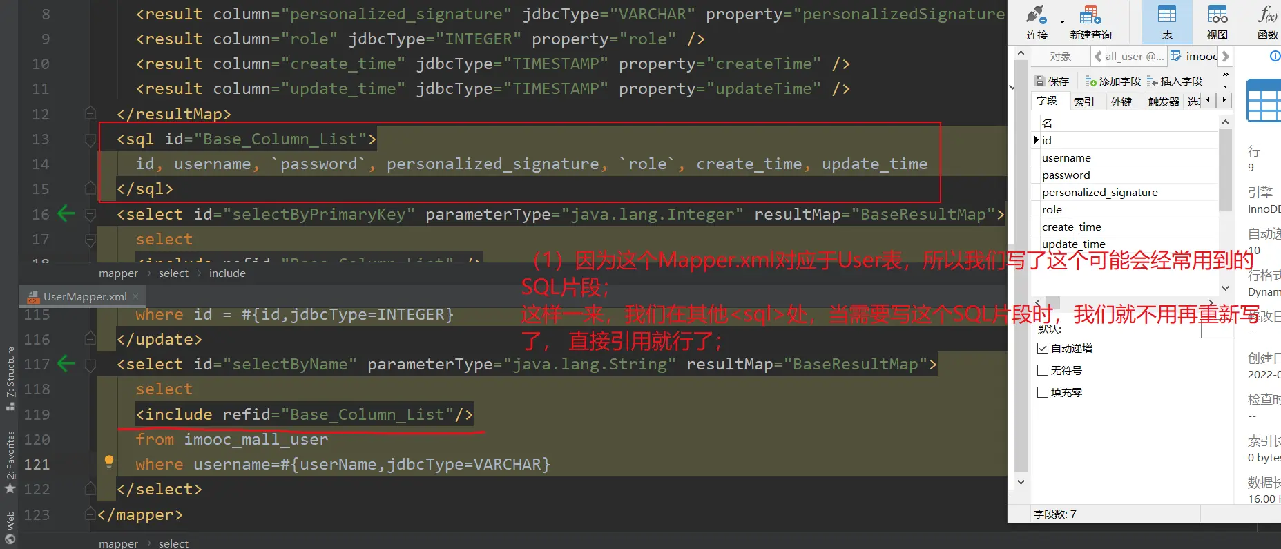(2) mybatis中的一个用法:【include refid=“Base_Column_List”/】,即使用include来引用SQL片段;