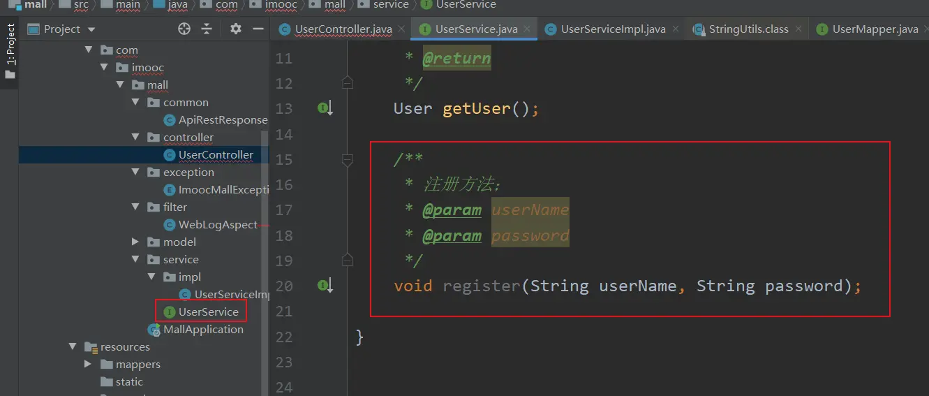 2.在UserService接口中,定义注册的方法:register()方法;