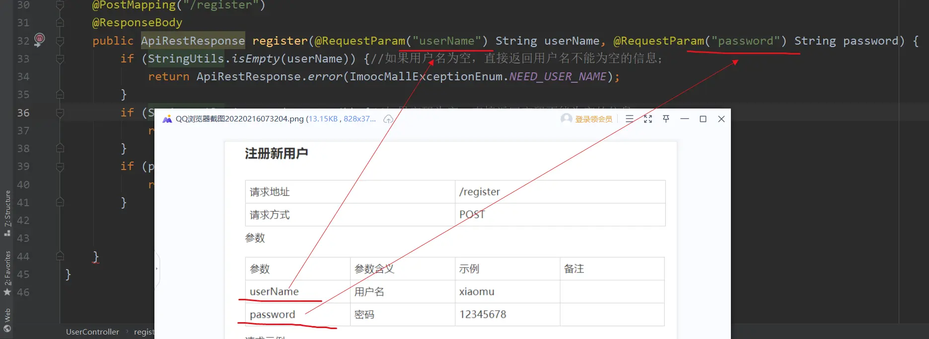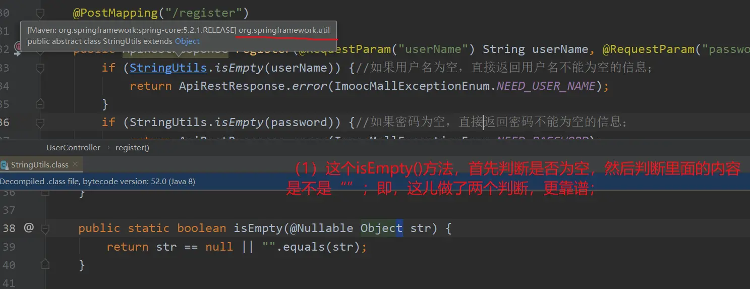 (4) 这儿判空时,我们没有使用【userName == null】的方式(因为,有的时候,前端确实传过来了userName,这个userName字符串是个空字符串;那么此时,这种方式就可能出现误判);而是使用的Springframework提供的一个工具【StringUtils.isEmpty(userName)】来判空;