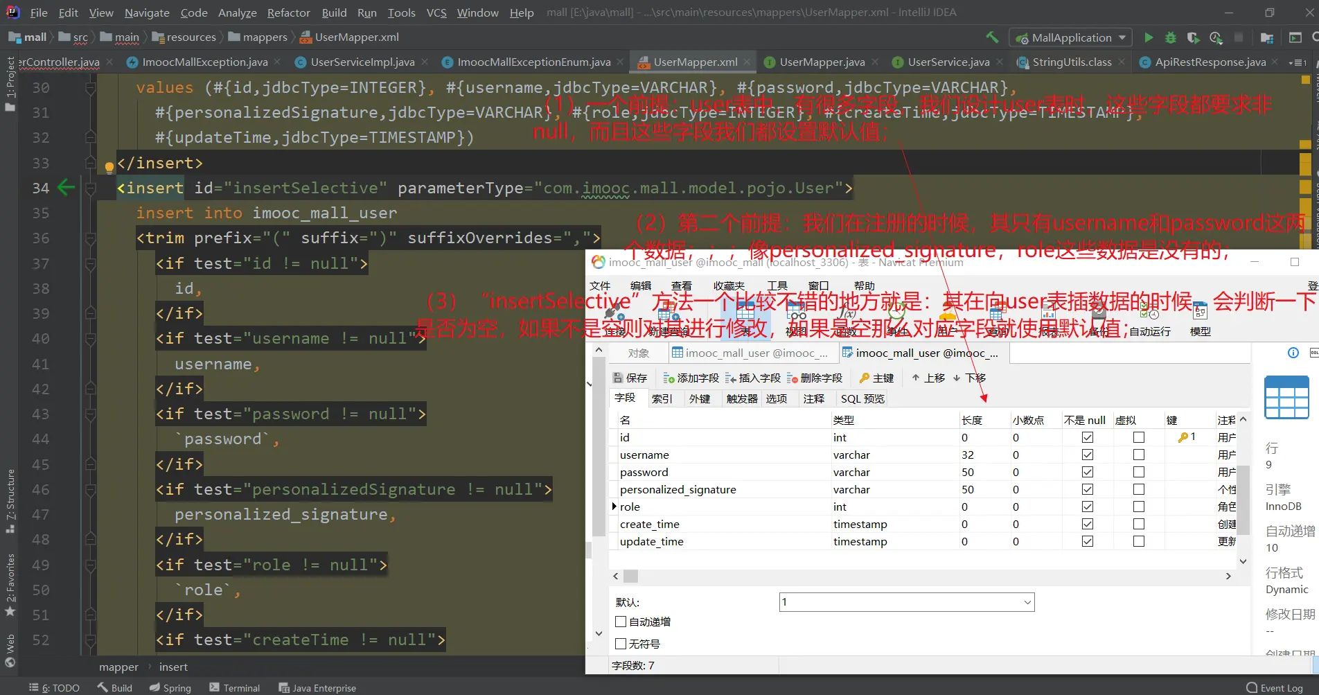 ● 通过上面的分析,就会明白,为什么注册的时候,我们使用【insertSelective()】方法,而没有使用【insert()】方法了;(因为注册的时候,User对象的属性,只有username和password是有值的)