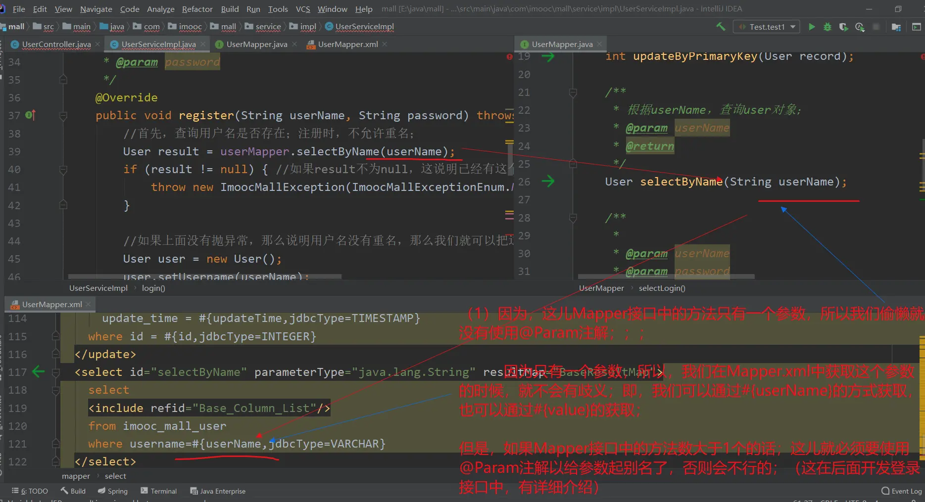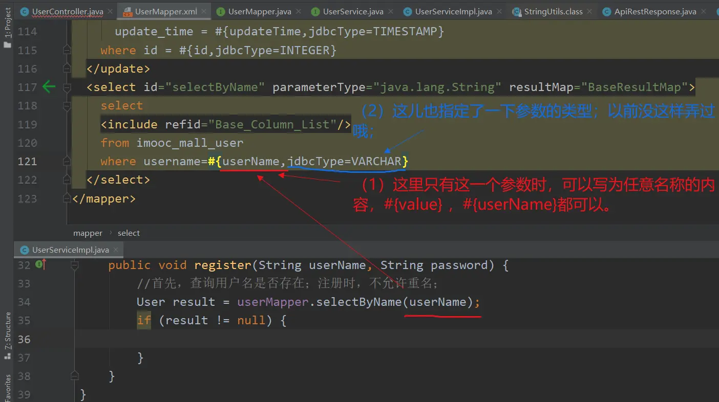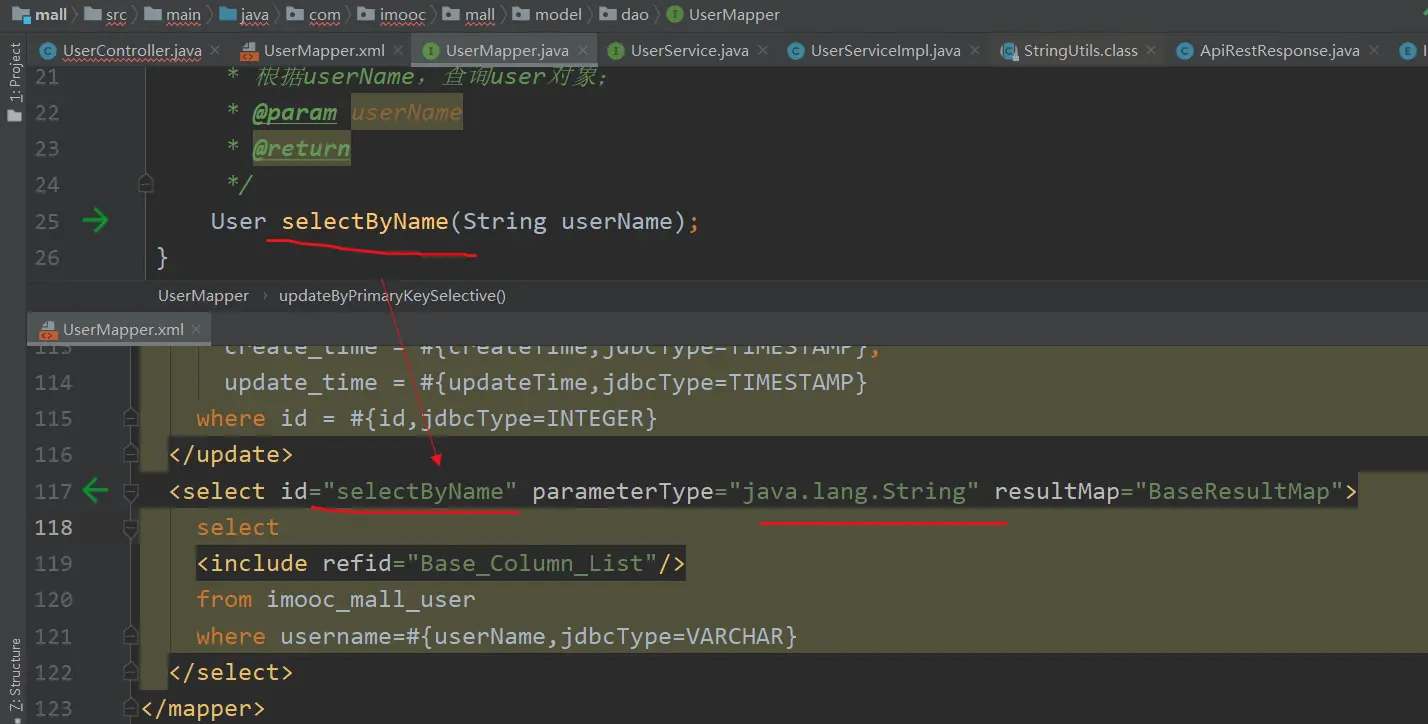 (1) 其中的【userMapper.selectByName(userName)】根据userName查询用户的方法,是我们自己定义的;参见下一部分:【4.在UserMapper接口中,定义根据userName查询用户的方法,并在UserMapper.xml中编写对应的SQL;】