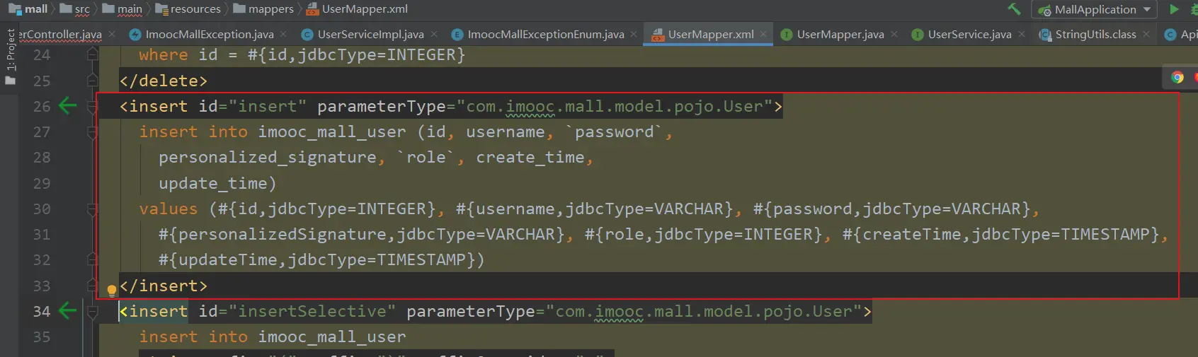 (5) 【userMapper.insertSelective(user)】说明: