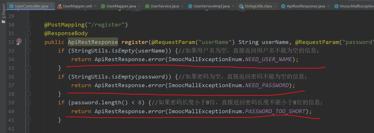 PS:自己以前做过的几个项目,这类【用户名不能为空】、【密码不能为空】、【密码不能小于8位】工作是放在前端来做的;但是,这儿我们把这个工作放在了后端来做;(这个情况,需要知道)