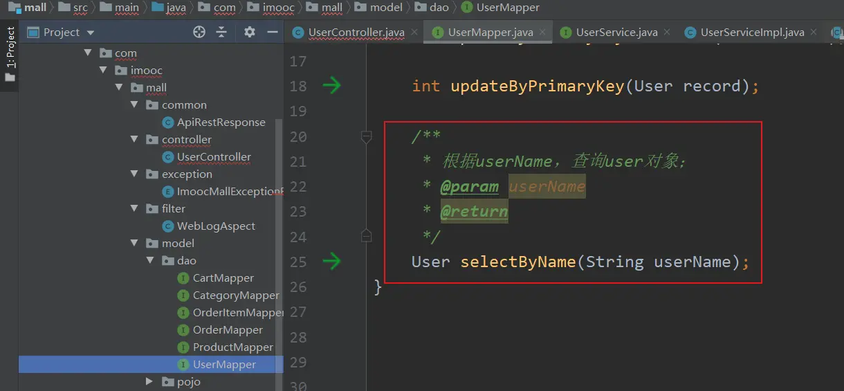 (1)在UserMapper接口中,定义根据userName查询用户的方法;