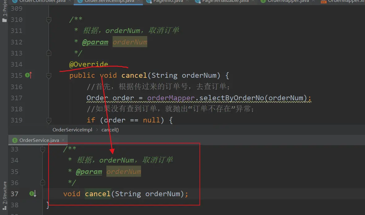 (2) 我们在Service层,编写了一个根据订单号,取消订单的业务方法:cancel()方法;将在下一部分介绍;