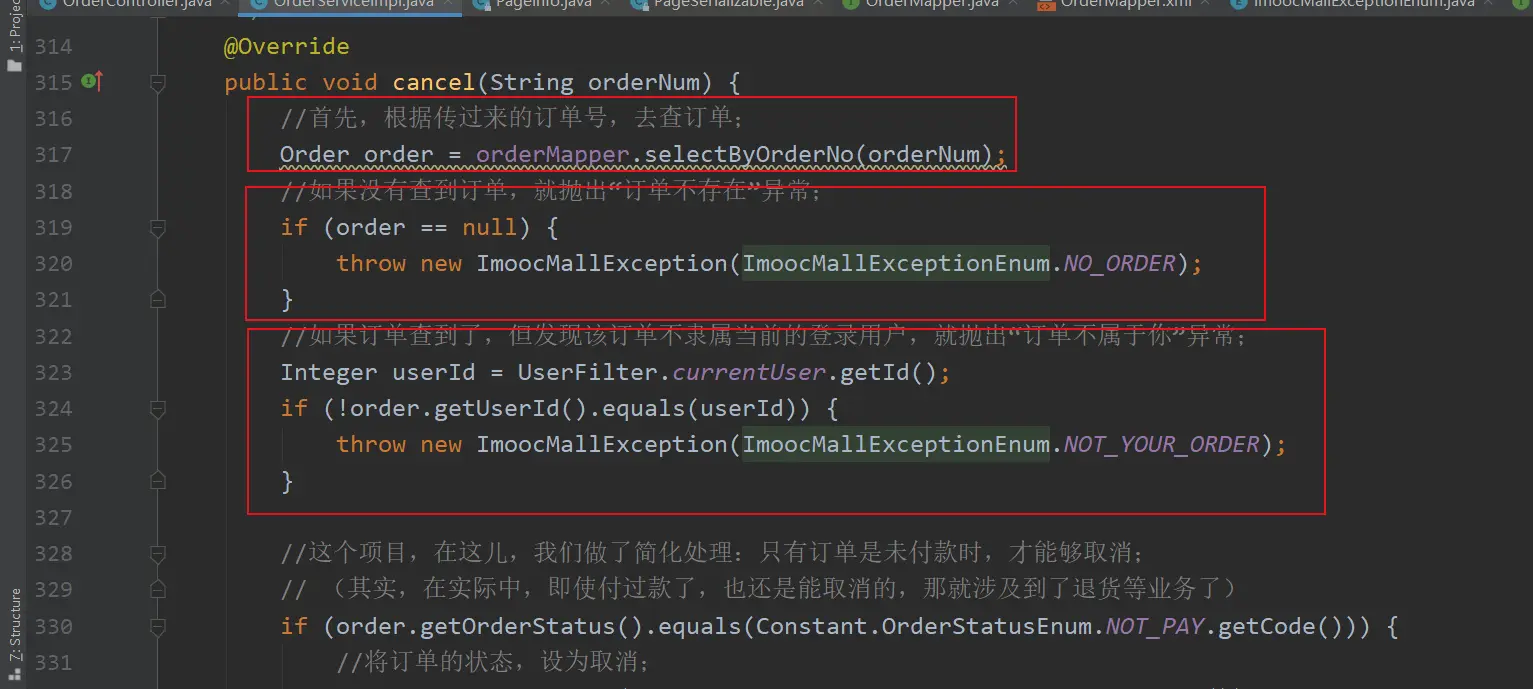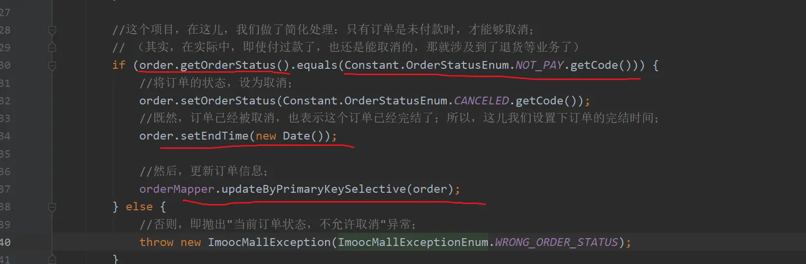 (2) 然后,本项目,在这儿作了简化处理:只有当订单是未付款状态时,才能够取消;可以看到,这儿对于订单状态信息,使用了前面我们定义的枚举类;