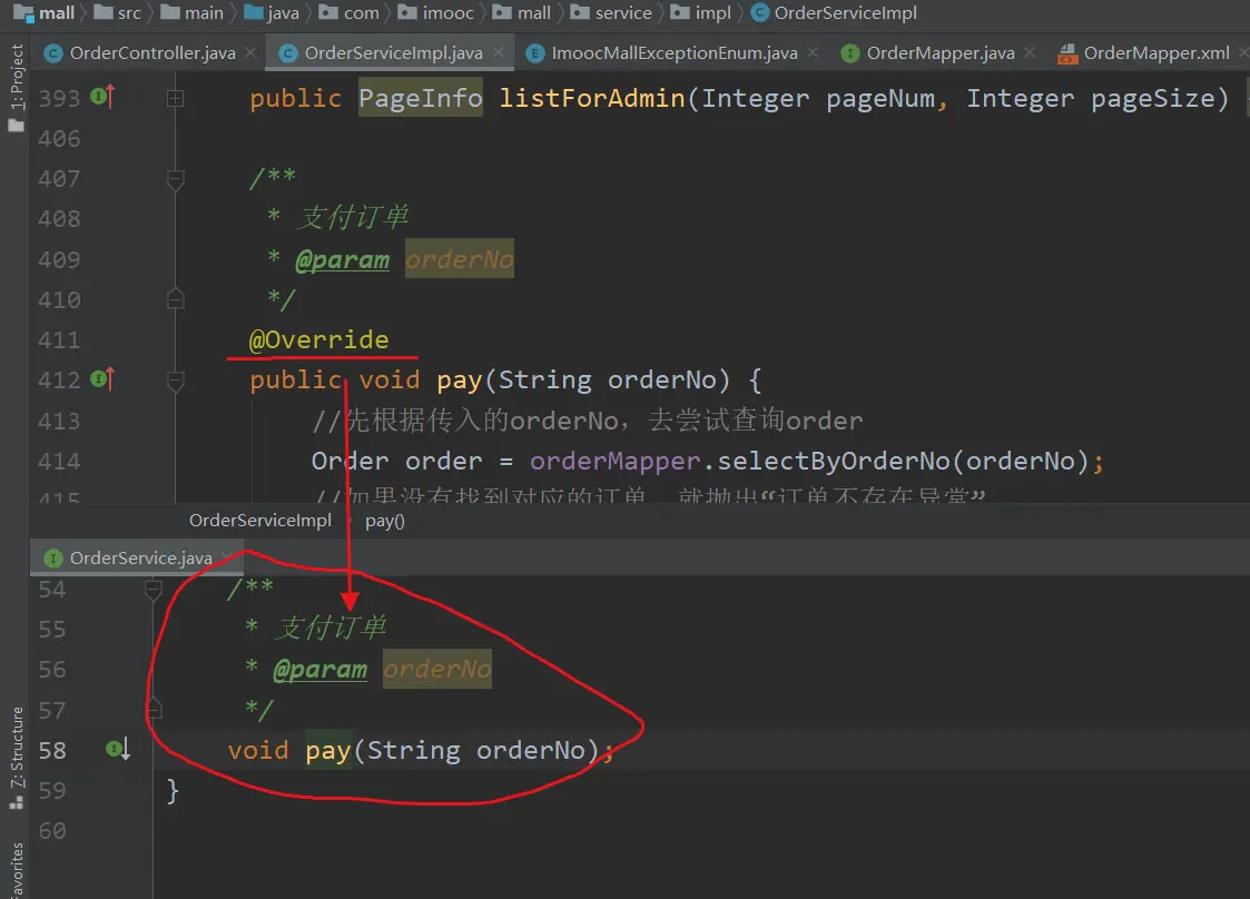 (2) 我们在Service层编写了支付的逻辑方法,pay()方法;这将在下一部分介绍;