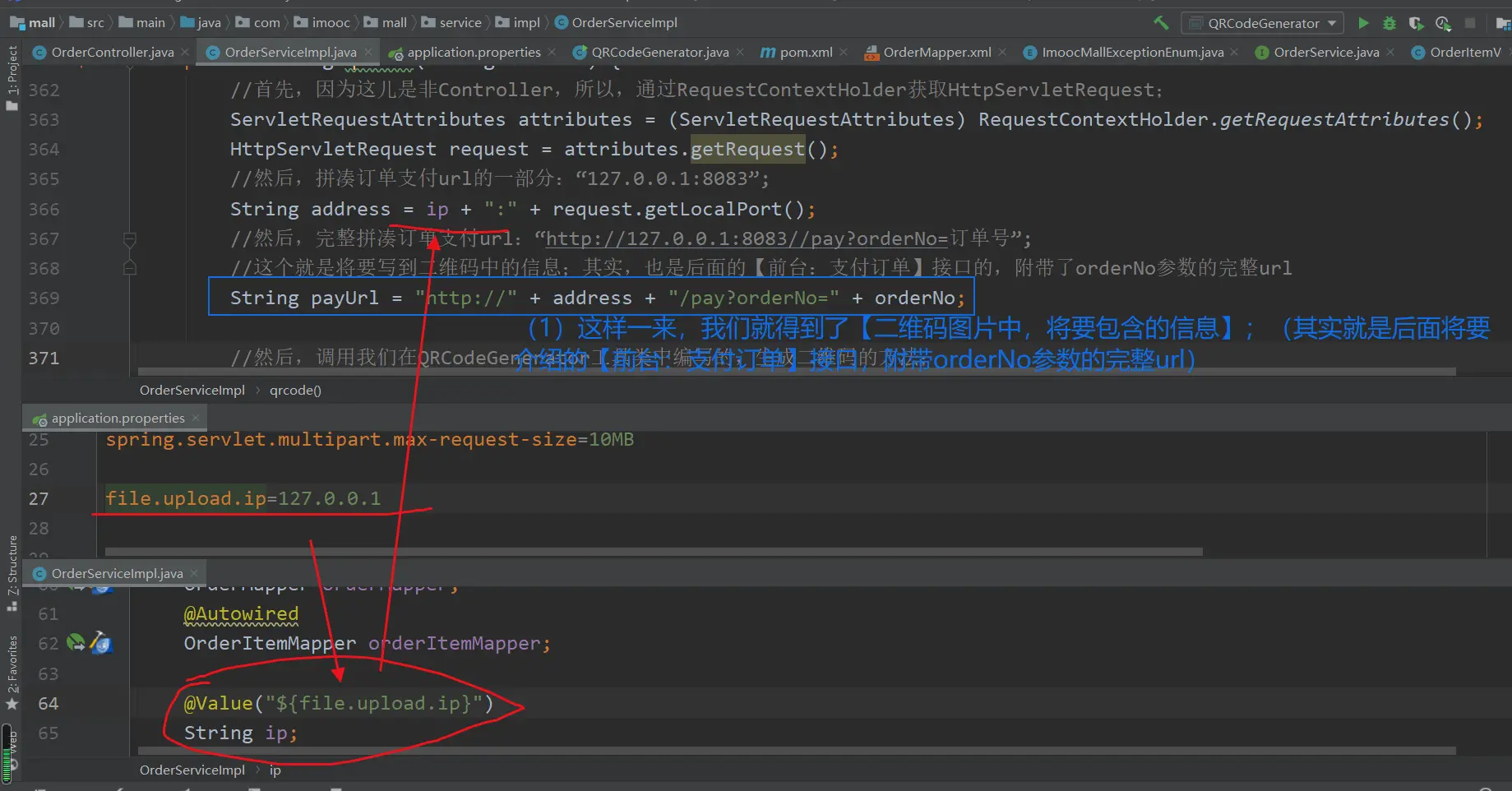(3) 自然,要拼凑【前台:支付订单】的完整url,还需要当前应用所部署服务器的url;这儿因为我们目前是开发阶段,也就是我们在测试的时候,服务是部署在本机,所以此时的url就是127.0.0.1;我们在application.properties中配置了url;