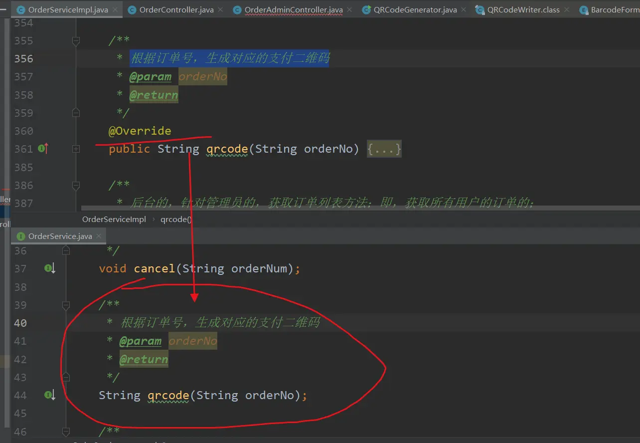 4.在OrderService中,反向生成qrcode()方法的方法声明;
