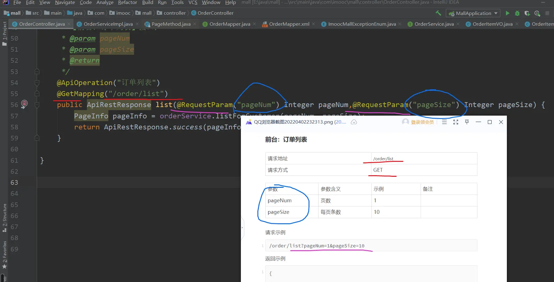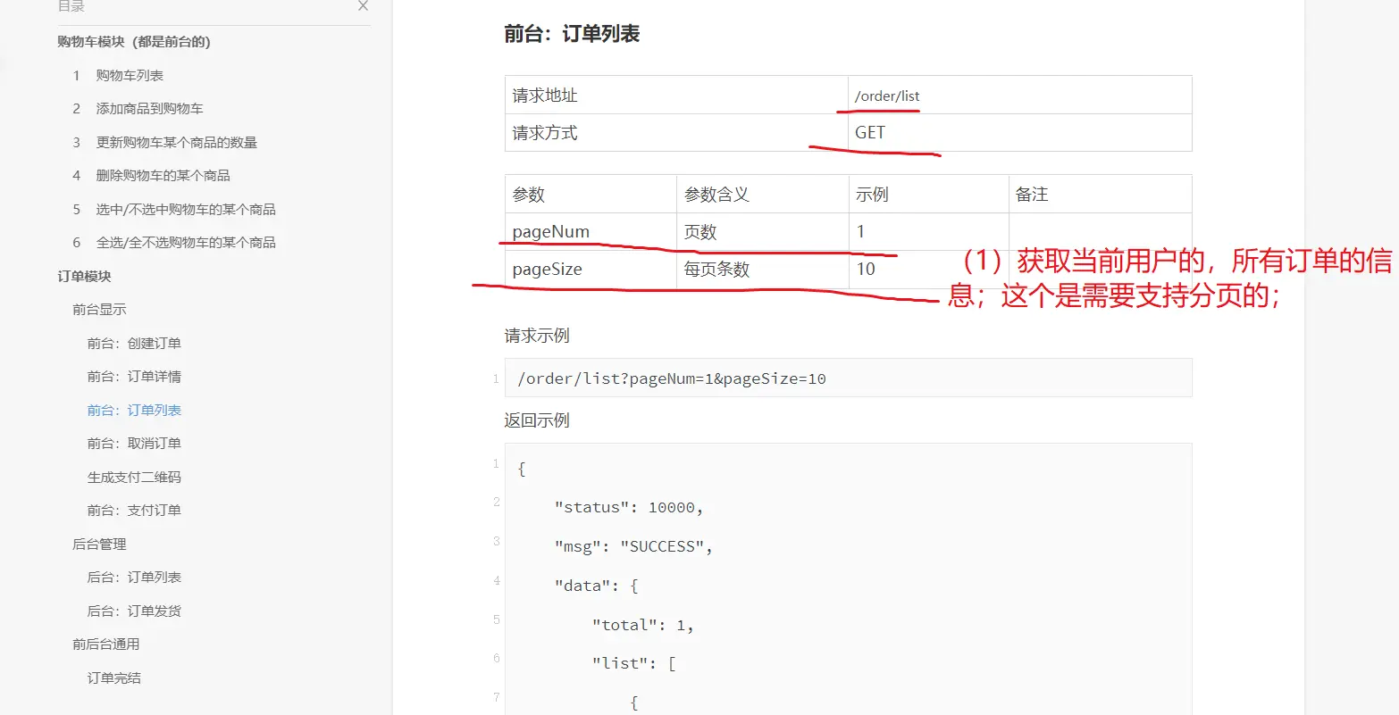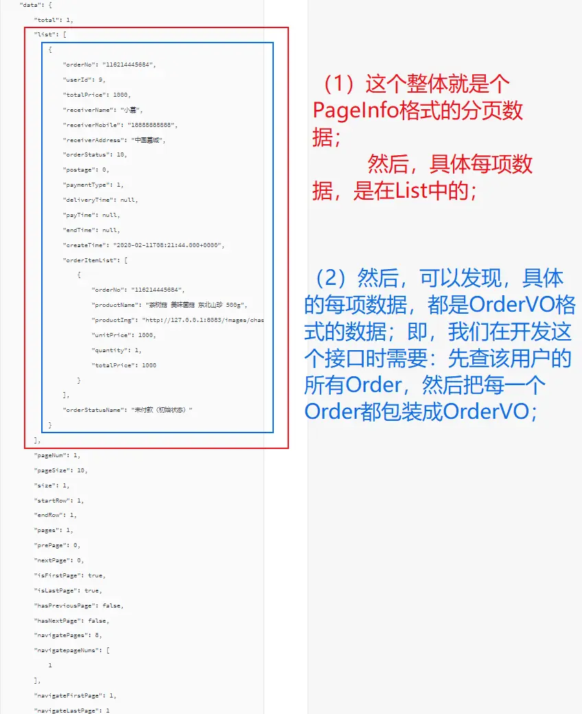 ● 这个接口,获取的是:当前用户的、订单列表;自然,一个用户可能有多个订单,所以,这个接口是分页的;(而且,根据接口要求,可以发现,我们可以通过PageInfo去包装分页数据)