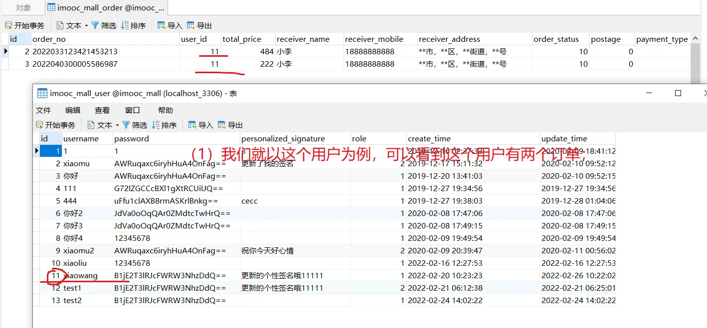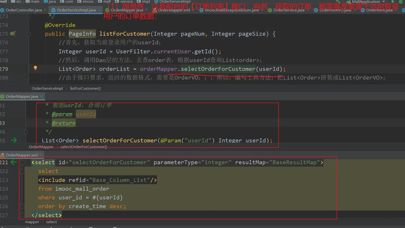 (1) 首先,我们根据当前登录用户的userId,去查询隶属于该用户的所有订单信息;(为此,我们在OrderMapper中,定义了一个根据userId查询order的方法)