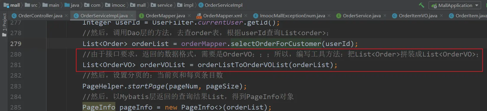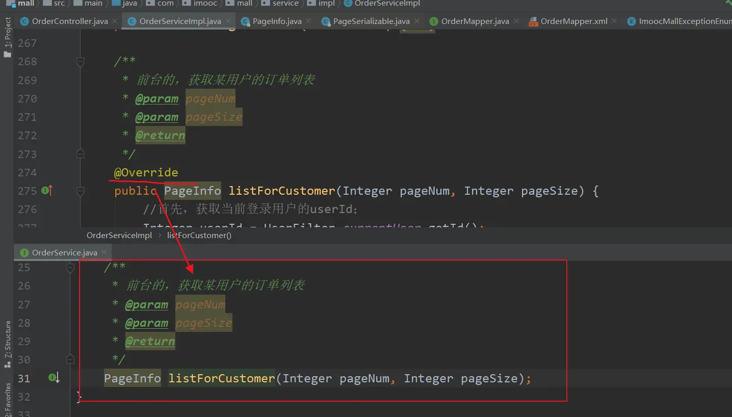 (2) 我们在Service层,编写了一个针对获取【前台:订单列表】的逻辑方法:listForCustomer();在下一部分会介绍;