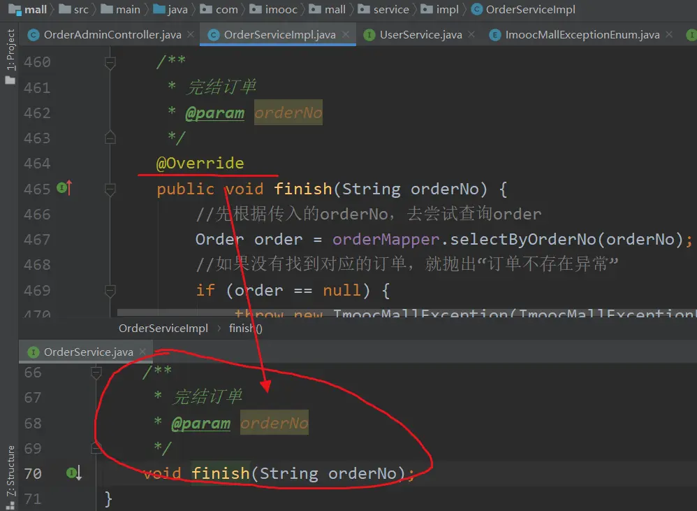 3.在OrderService中,反向生成finish方法的方法声明;