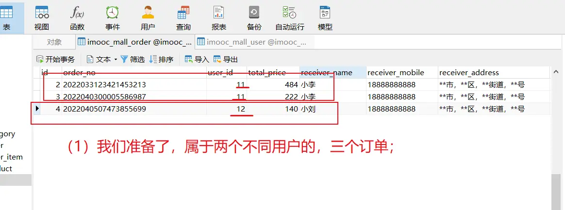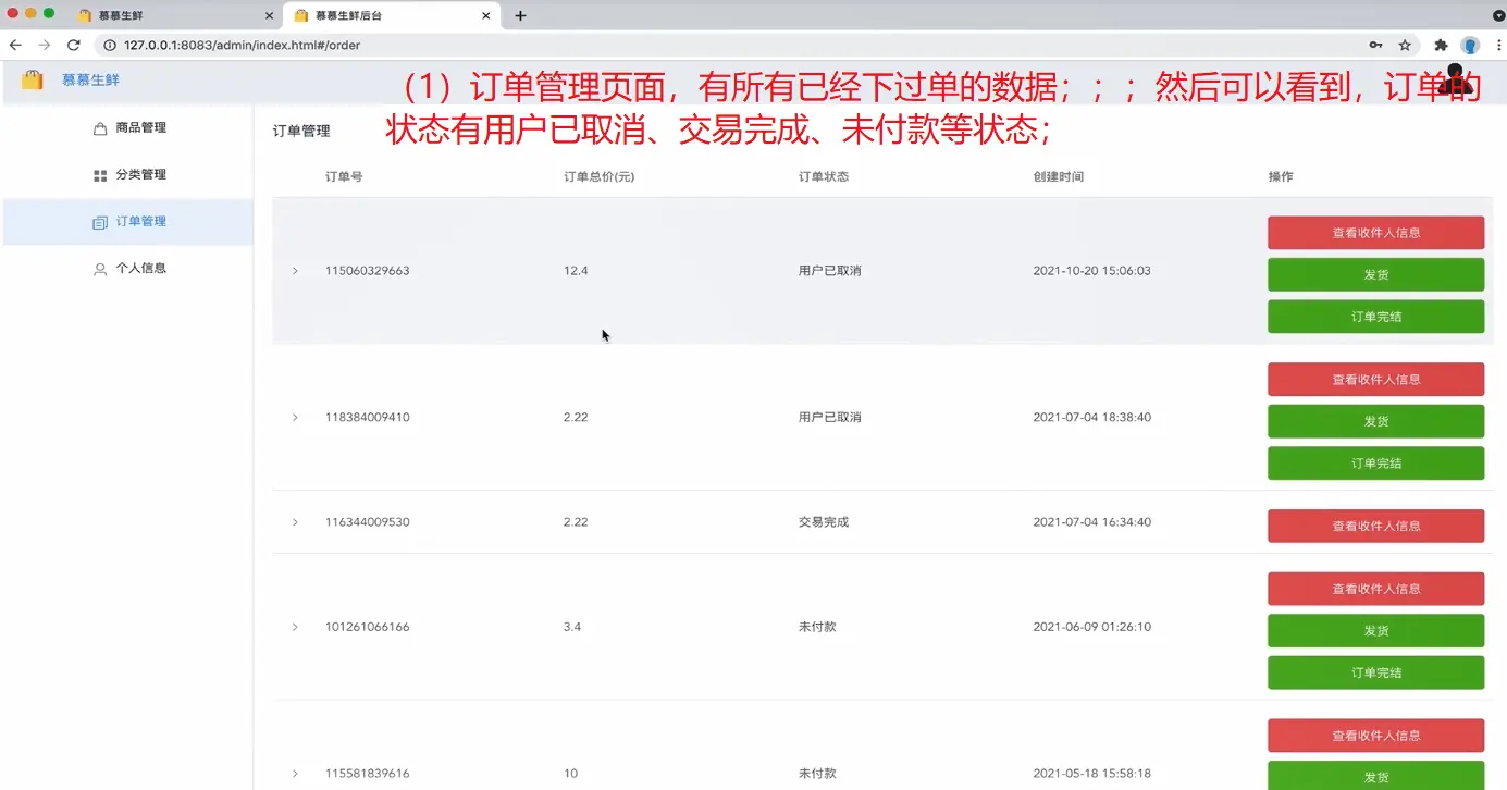 然后,【后台:订单列表】接口和【前台:订单列表】接口,获取的数据格式是一样的;只是,【前台:订单列表】接口获取的只是当前登录用户的订单数据;【后台:订单列表】接口获取的是所有用户的订单数据;