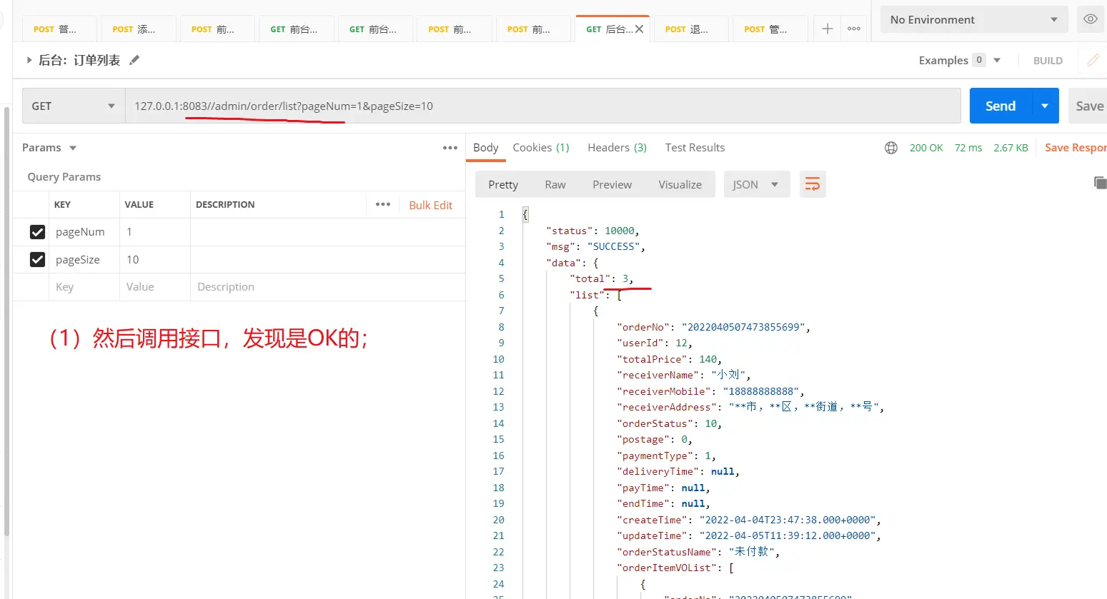 2.【后台:订单列表】接口,在接口上的表现;