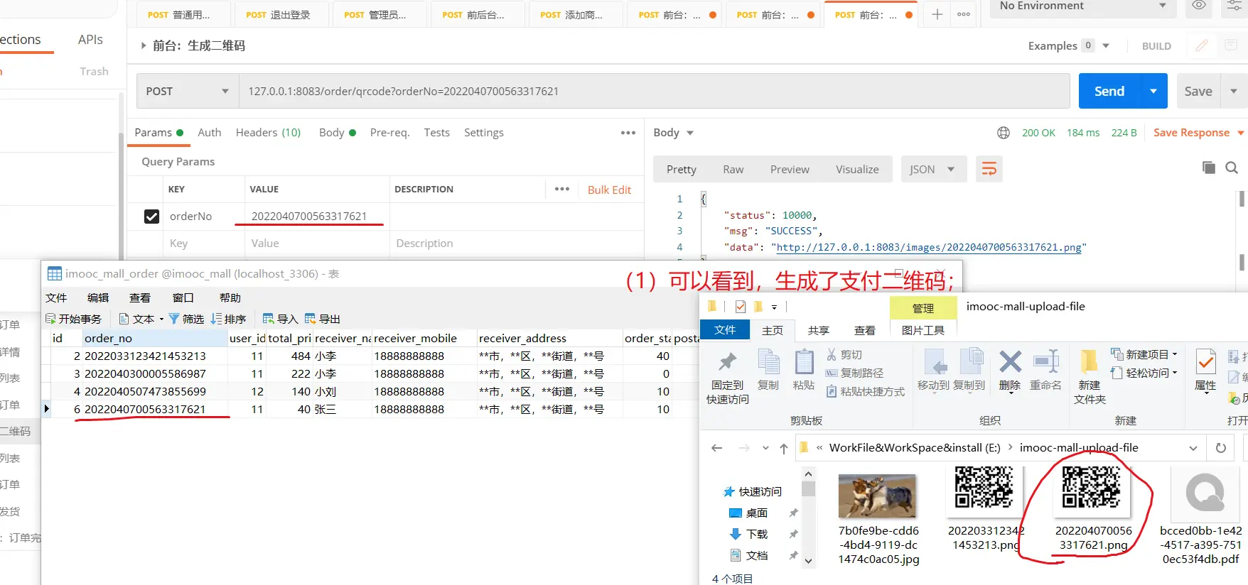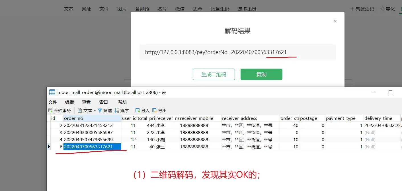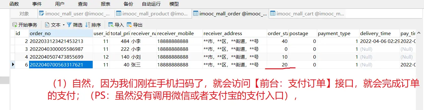(5) 然后,测试扫码支付;(PS:为了方便,我们手动把上面的订单状态改为10;这样一来,就不用再重新添加商品到购物车、重新下单了;)
