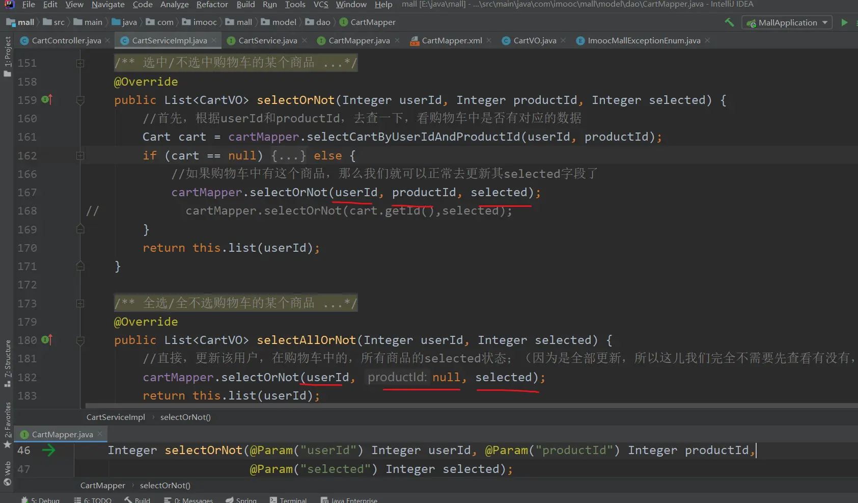 (1) 这儿,我们依旧调用在开发【选中/不选中购物车的某个商品】接口时,在Dao层开发的方selectOrNot()方法;只是,才是productId这个参数我们传的是null;