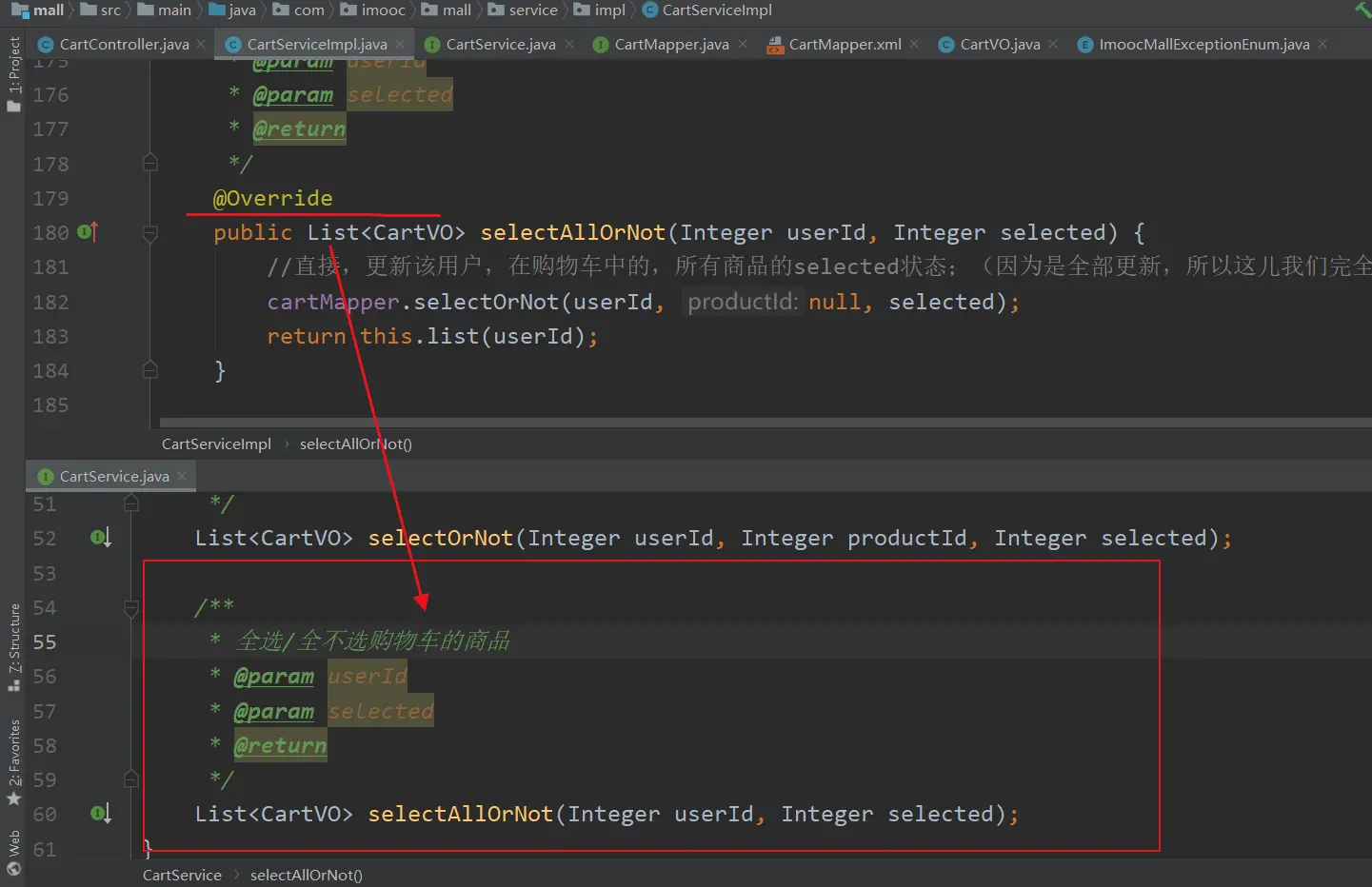 2.在CartServiceImpl中,创建全选/全不选购物车的商品的逻辑方法:selectAllOrNot()方法;并在CartService中反向生成方法的声明;