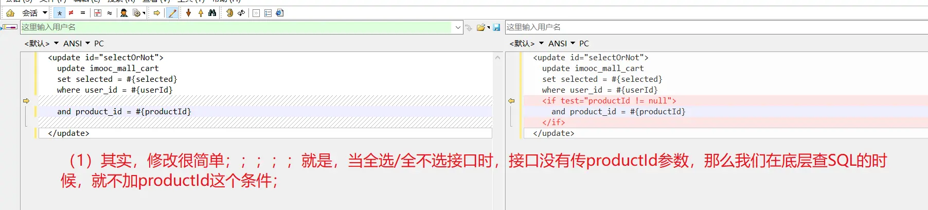 (2) 为了能够复用这个方法,让其能同时满足【选中/不选中购物车的某个商品】接口、又能满足【全选/全不选购物车的商品】接口;我们处理了其实现SQL;(这在下一部分会介绍)