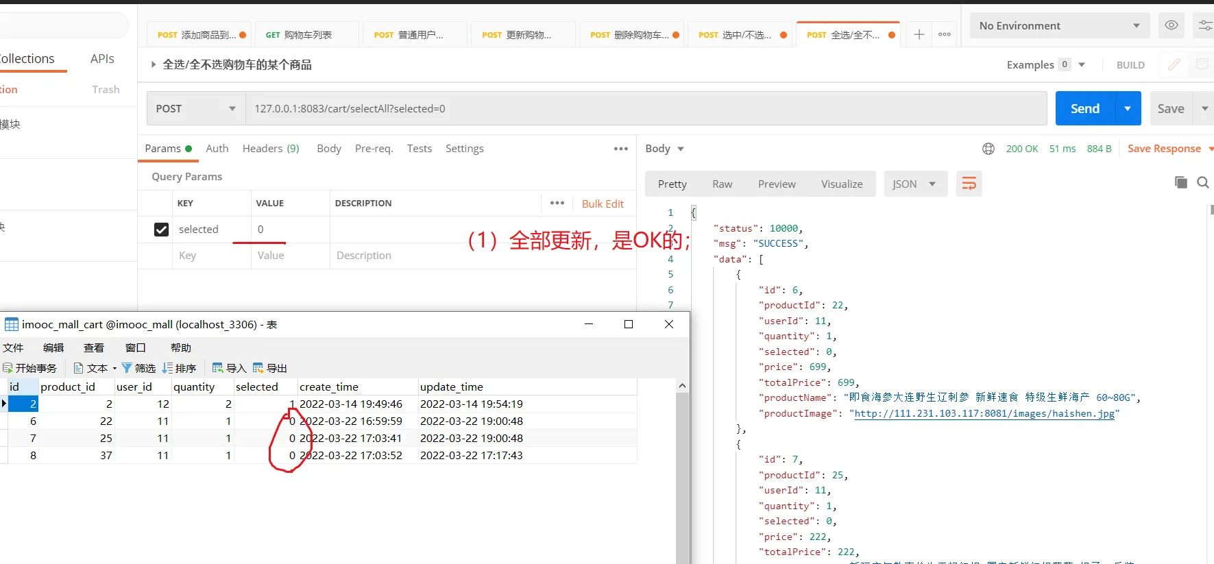 (1) 本篇博客主要内容是开发【全选/全不选购物车的商品】接口;其实,这儿选中与否,就是更新购物车中该商品的selected字段的值;