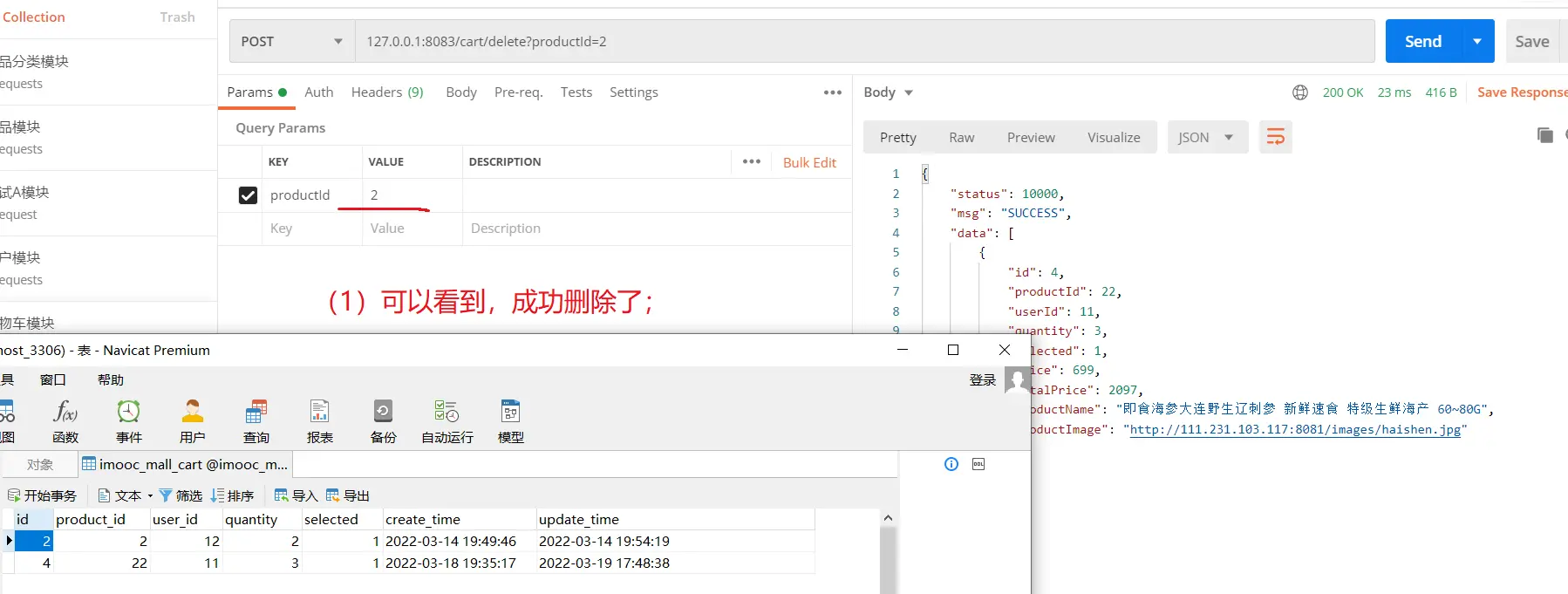 2.【删除购物车的某个商品】接口,在界面上的表现;