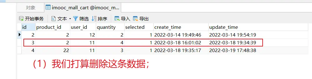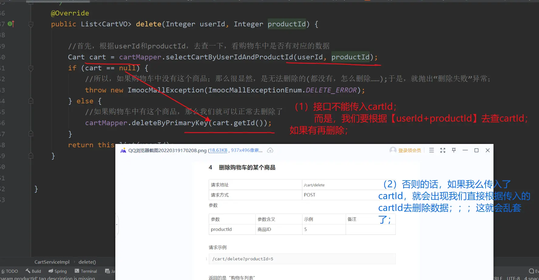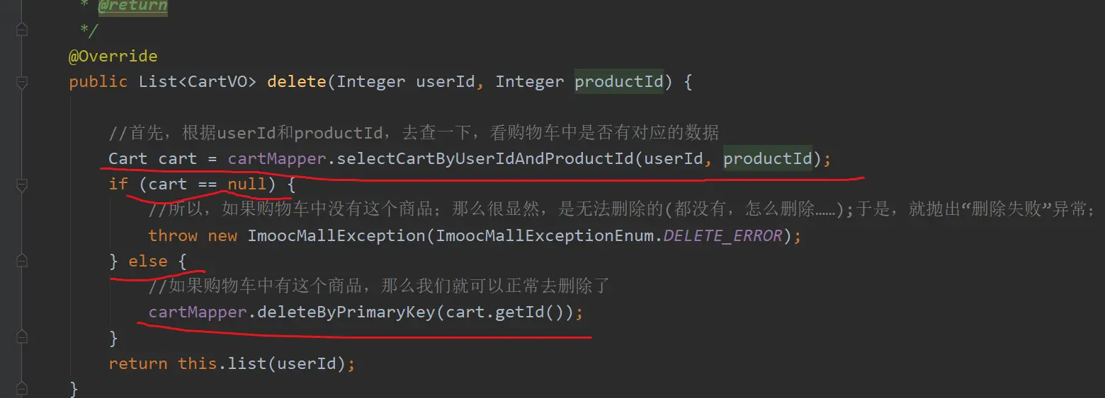 (1) 删除的时候,需要先看下,根据【当前用户 + productid】两个条件,看下购物车中,我们要删除的这个商品是否存在;如果存在就去删除,否则就抛出“删除失败”异常;