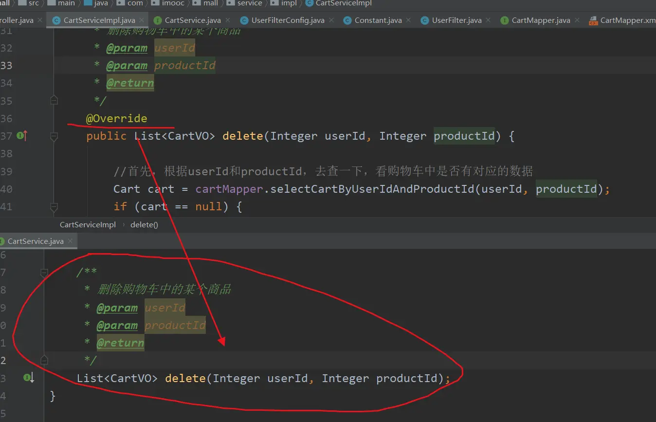 2.在CartServiceImpl中,创建删除购物车某个商品的方法delete()方法;并在CartService中,反向生成方法的声明;