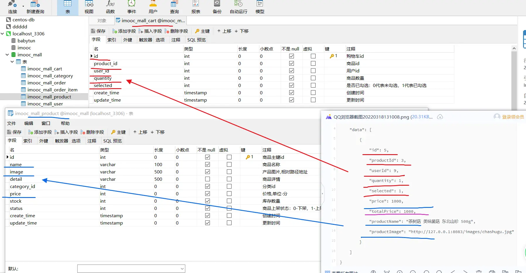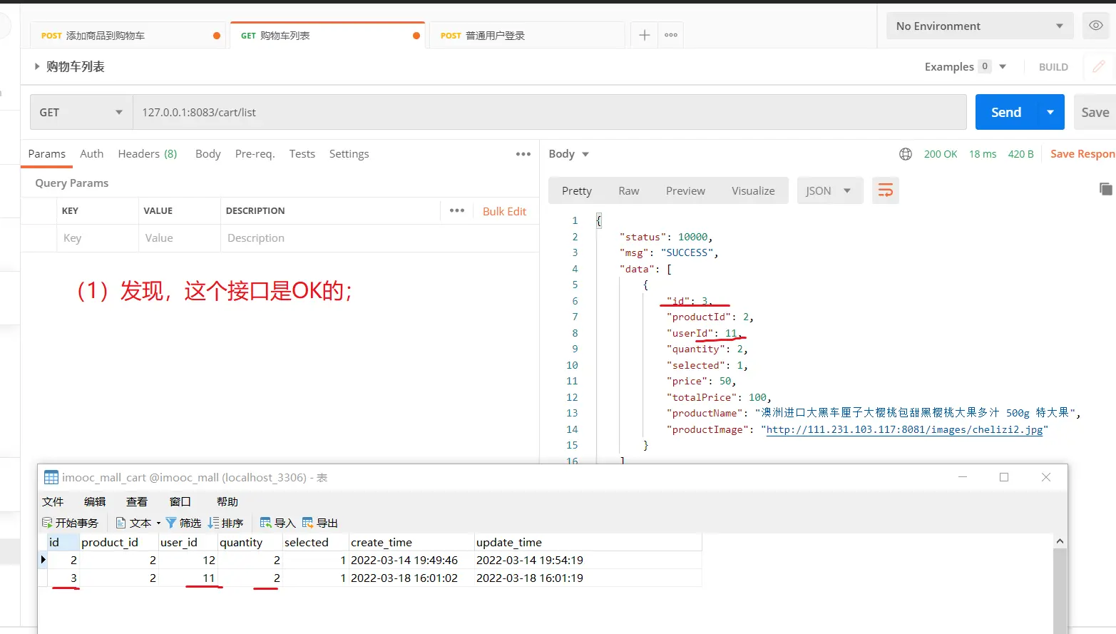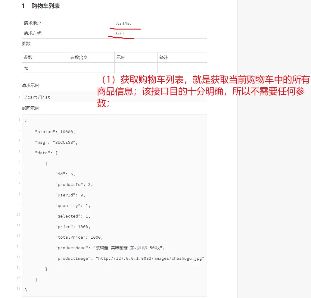 ● 可以看到,【购物车列表】接口对返回数据的要求,其包括了cart表的内容、也包括了product表的内容、也有一个totalPrice;