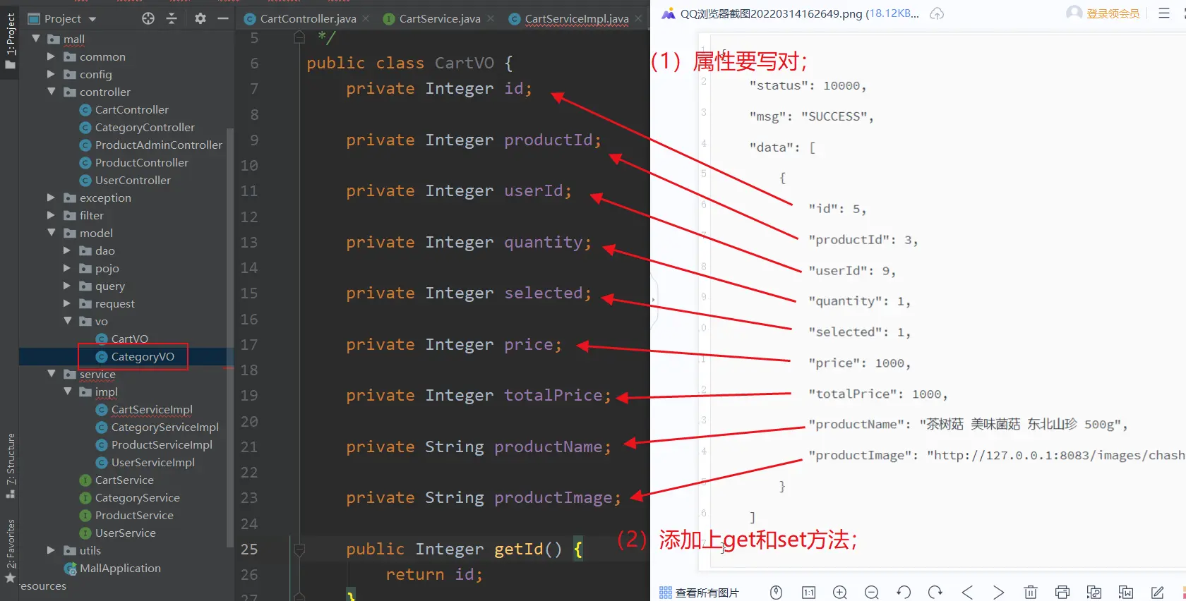 (2)购物车返回的数据:创建CartVO来包装返回给前端的数据,以符合接口对返回数据格式的要求;