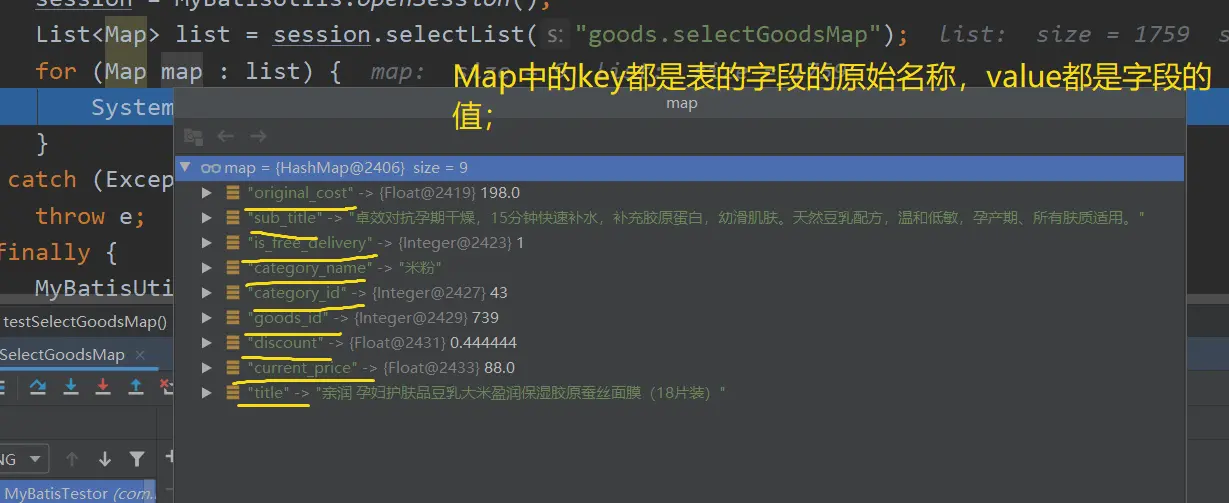 ● 然后,如果是多表查询,即我们查询的结果中包含多张表的字段;一种不推荐的做法,是使用Map去承载查询结果;可以参考【MyBatis获取多表关联查询结果】;