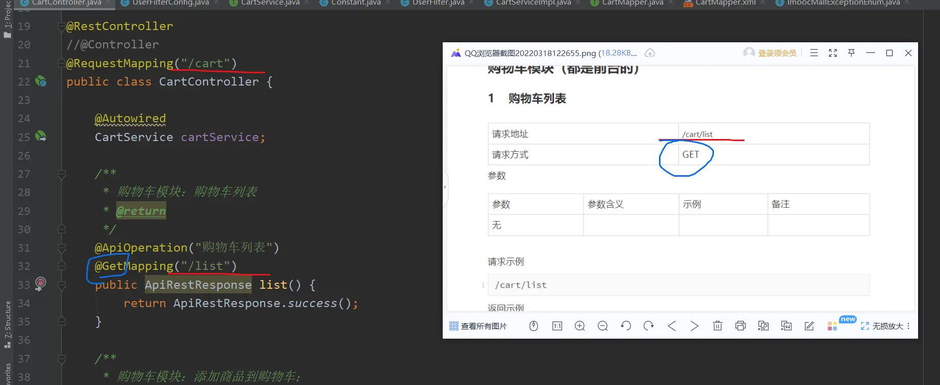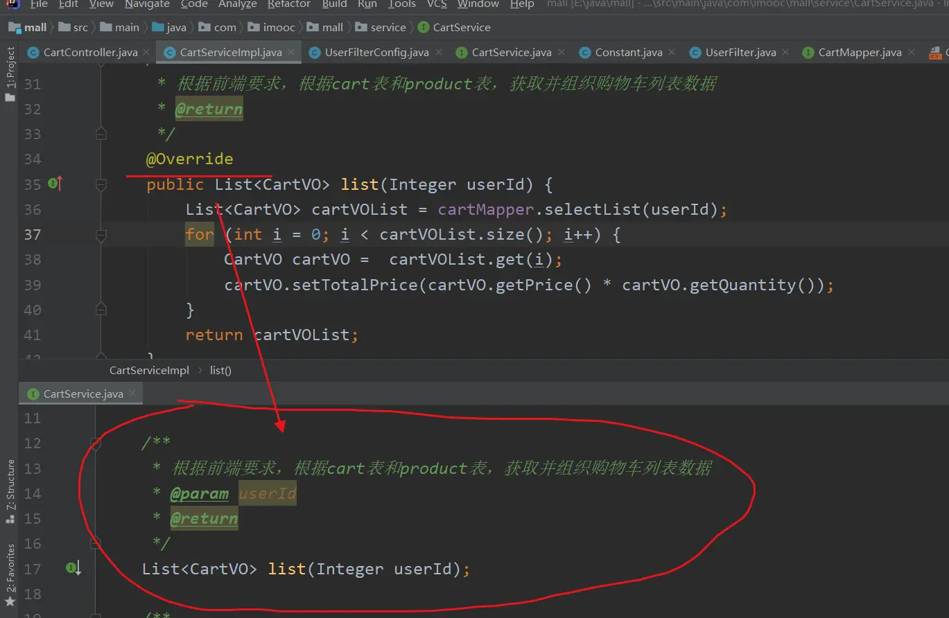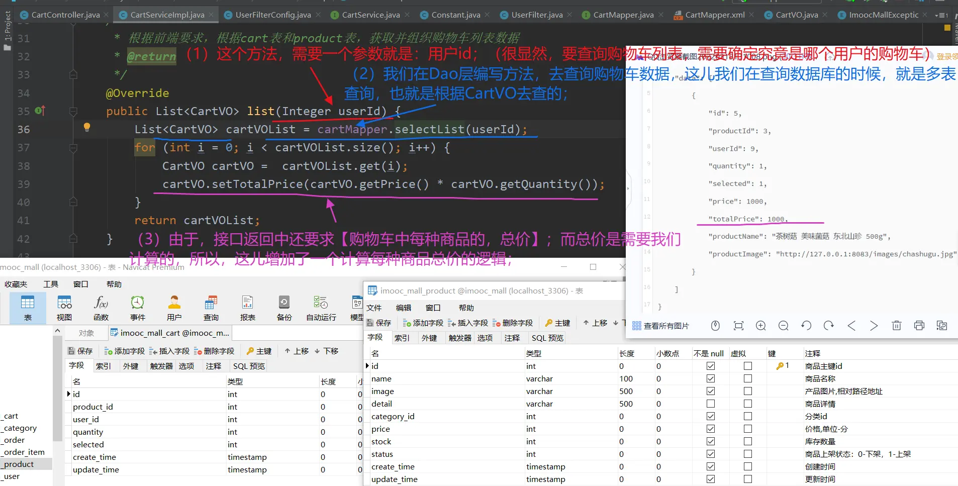 (3) 【购物车列表】接口:这儿的逻辑是:【我们本来创建CartVO的目的是,使用CartVO来包装返回给前端的数据,以符合接口对返回数据的格式要求】→【自然,这个接口,最终在Dao层,是需要查询多张表的;也就是说,这个底层是需要多表关联查询的】→【而,恰好,我们可以使用CartVO去直接承载多表关联查询的结果;(PS:自己能感觉到,这儿所谓的“恰巧”,在实际开发是可以广泛应用的)】;