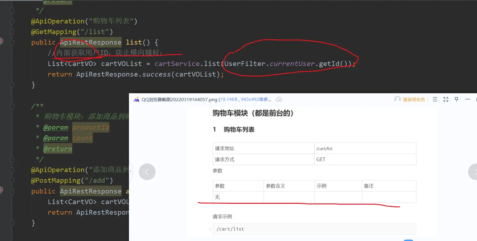 **(3)本篇博客出于安全考虑:而采用的一种广泛采用的做法: 接口不能传入用户id,而是要在程序内部获取;否则,如果接口参数中有用户id的话,这很可能会被黑客利用,黑客就可以通过这个接口查看任何人的购物车信息了;