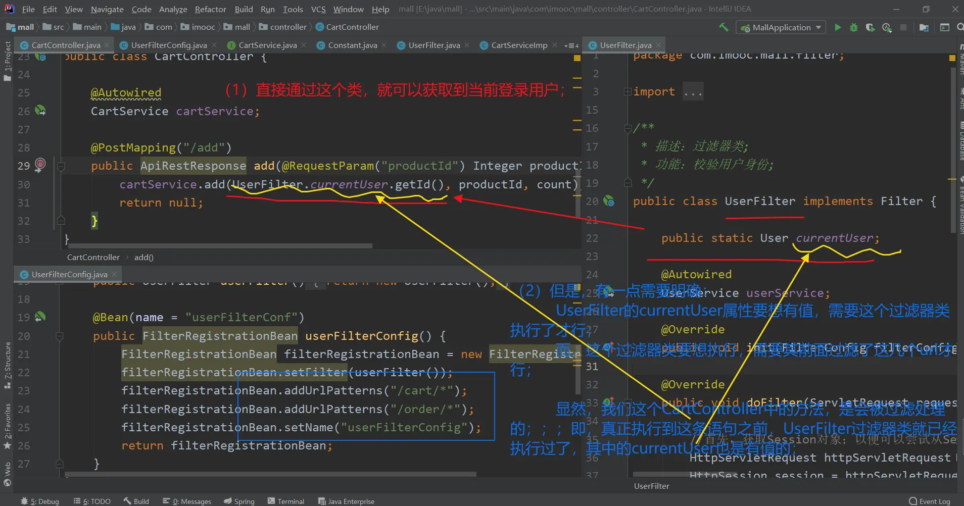(4) 因为,这个接口会被在【SpringBoot电商项目购物车模块统一校验当前是否有用户登录】中编写的过滤器给处理;所以,我们可以通过UserFilter来获取当前登录用户;(PS:这儿用的add()方法中来阐述的,其实list()方法中,是一样的;就不再新写一个了)