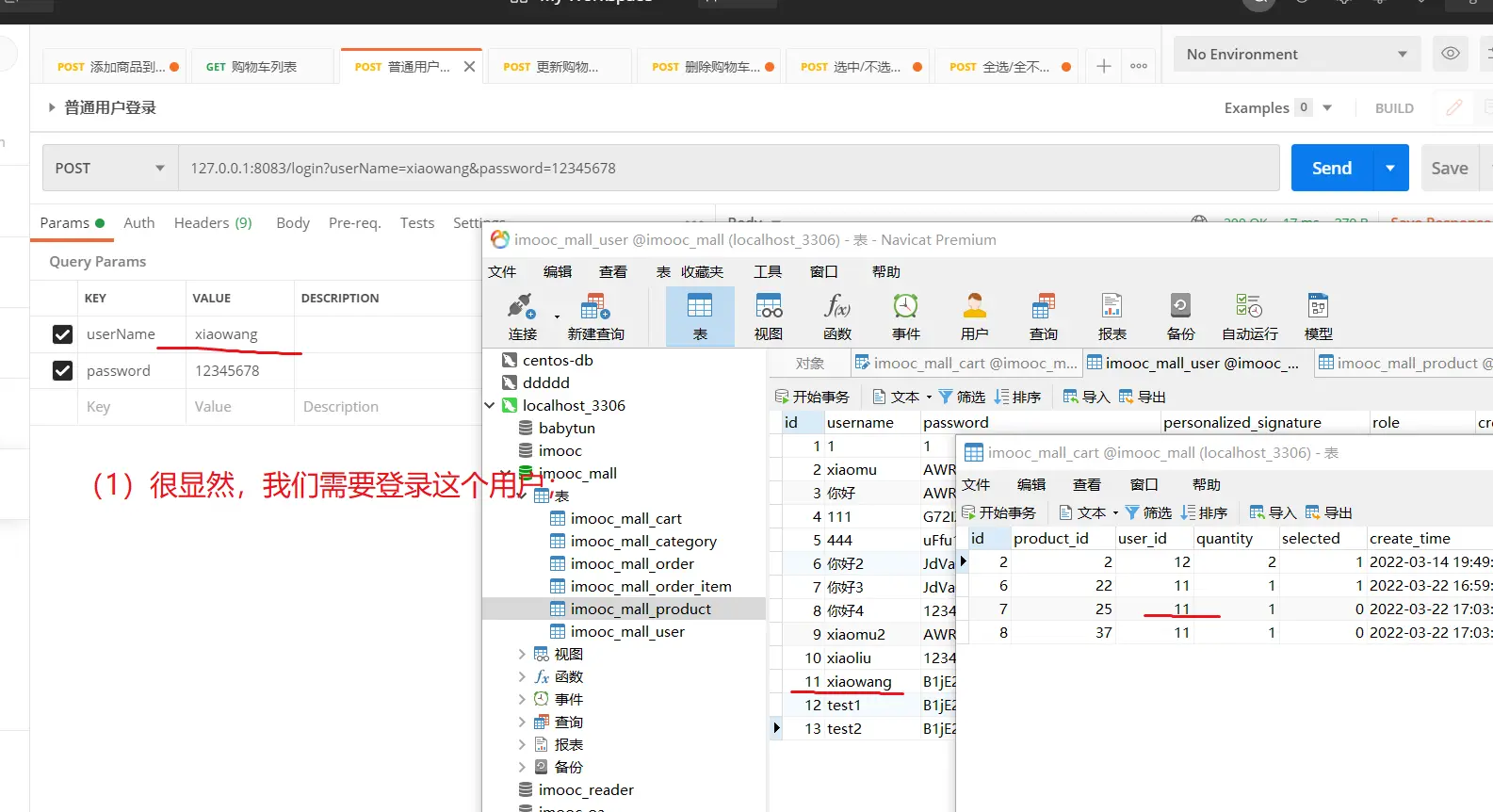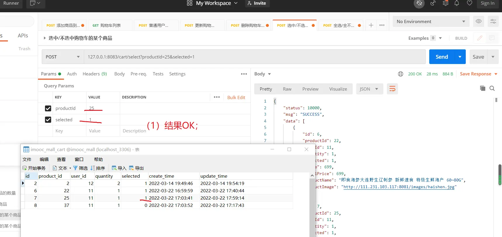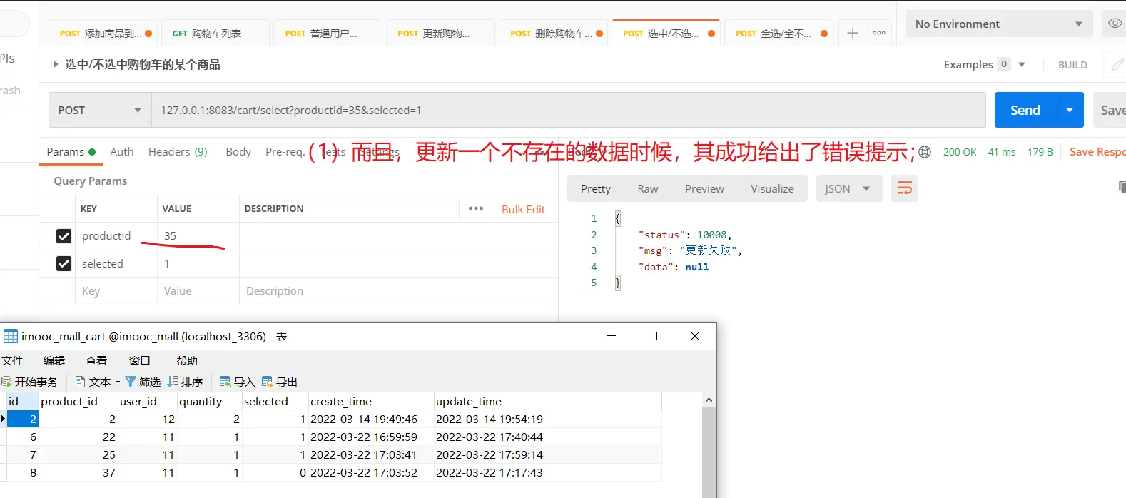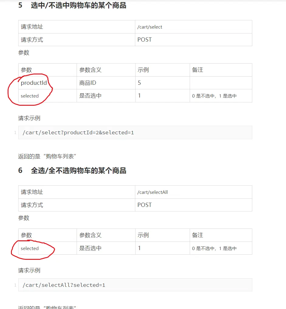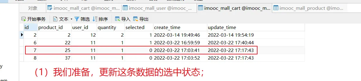 (1) 本篇博客主要内容是开发【选中/不选中购物车的某个商品】接口;其实,这儿选中与否,就是更新购物车中该商品的selected字段的值;