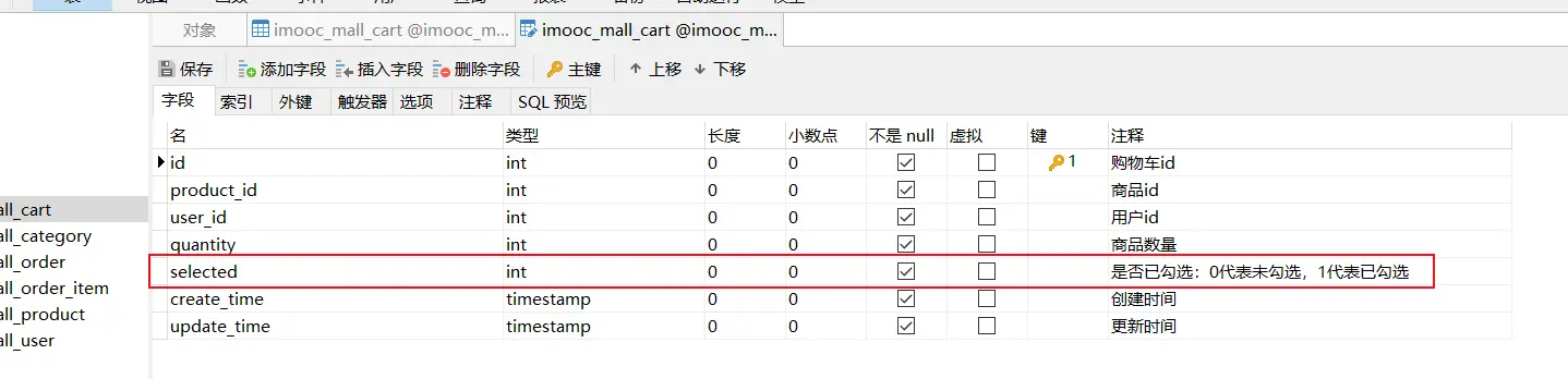 (2)一个尚未解决、需要留意的疑惑: 自己并没有在实际中,开发过【电商系统】;所以,有这个疑惑:【购物车中,某个商品是否被勾选】,究竟需不需要在数据库中中增加一个字段来表征;是不是,在有的电商系统中,【购物车中,某个商品是否被勾选】这个活完全交给前端就行了?(PS:这个疑问尚未解决;目前采用本项目的做法即可;)