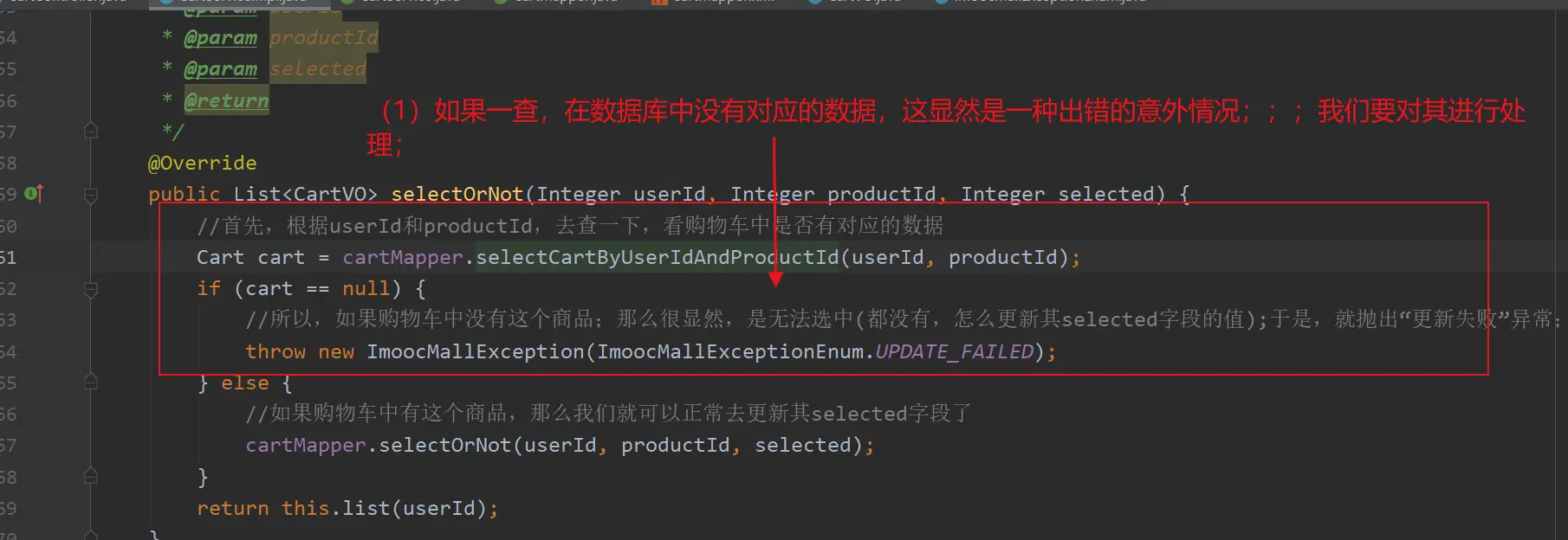 if (cart == null) {//所以,如果购物车中没有这个商品;那么很显然,是无法选中(都没有,怎么更新其selected字段的值);于是,就抛出“更新失败”异常;