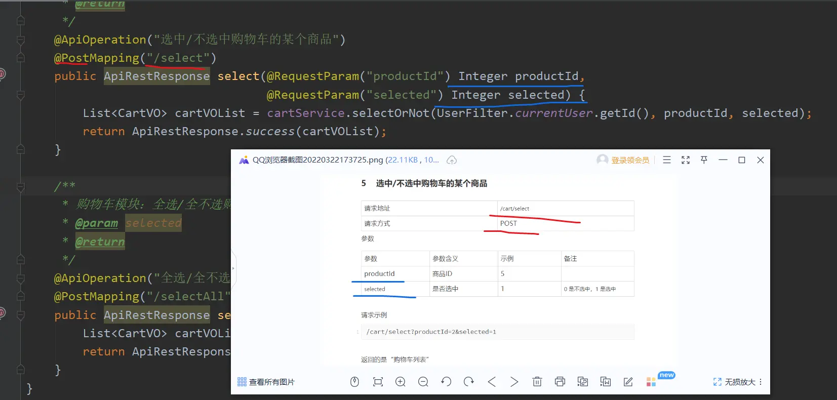 ● 那么,至于为什么没有这样写,是因为:【选中/不选中购物车的某个商品接口】和【全选/全不选购物车的某个商品接口】,差不多,我们想在这两个接口中,复用一点东西,以节省点工作量;