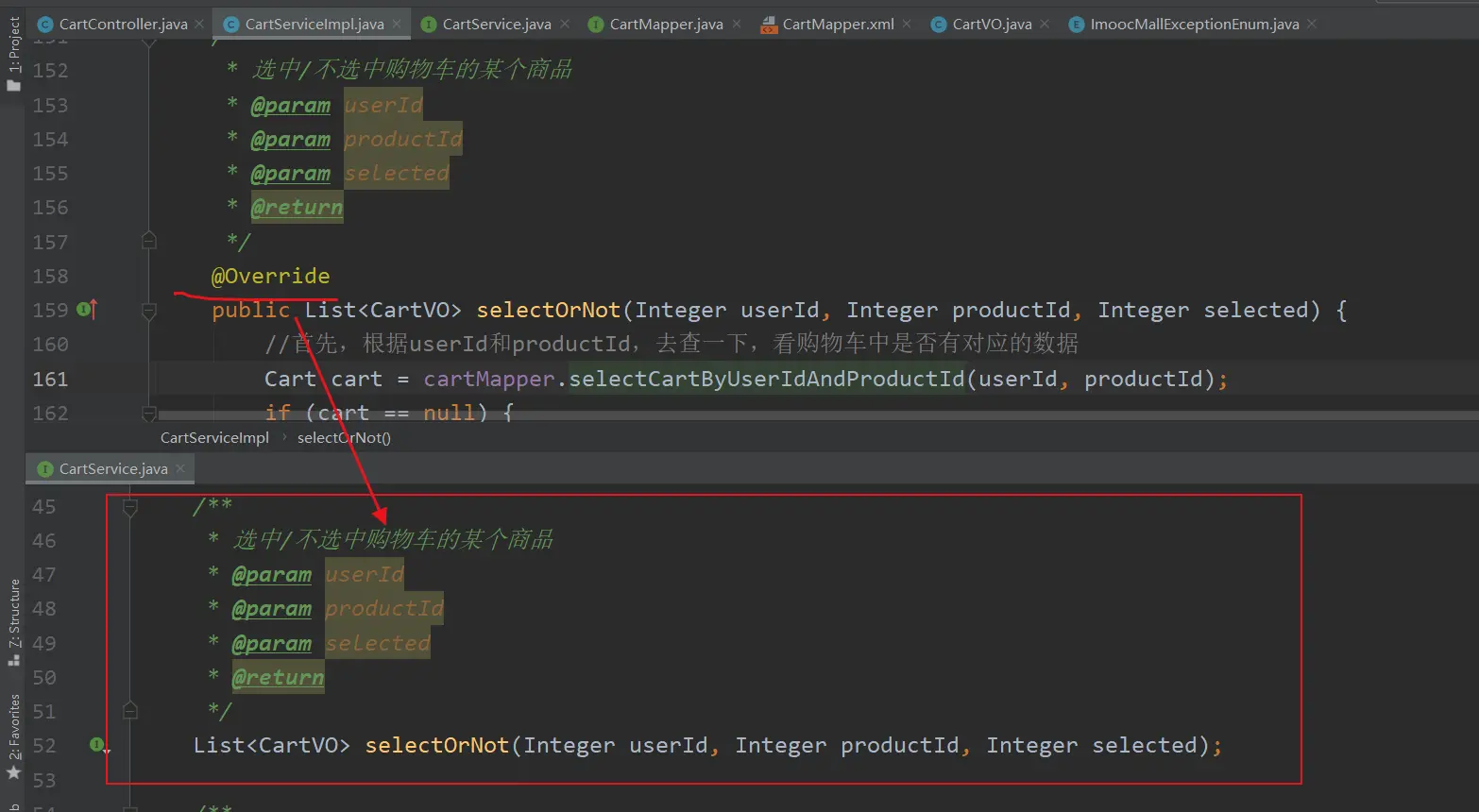 2.在CartServiceImpl中,创建选中/不选中购物车的某个商品的逻辑方法:selectOrNot()方法;并在CartService中反向生成方法的声明;