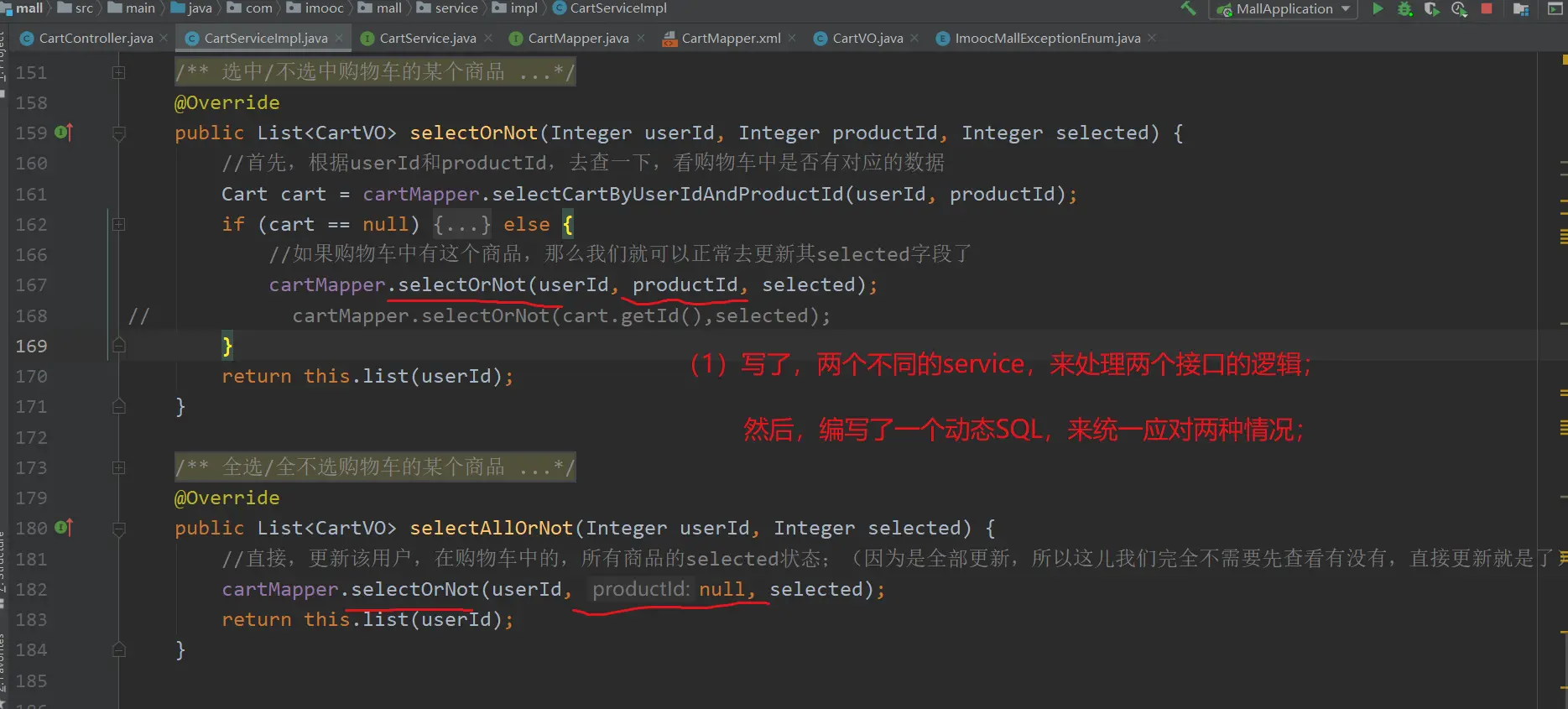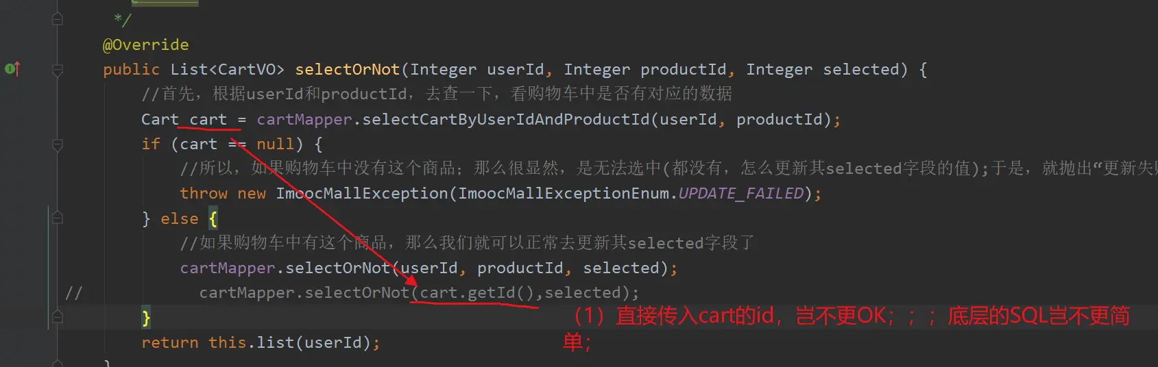 ● 所以,这儿我们的Dao层的方法,没有写成【selectOrNot(cart.getId(),selected);】这种传cartId的形式;而是写成了【selectOrNot(userId, productId, selected);】这种传userId和productId的形式;