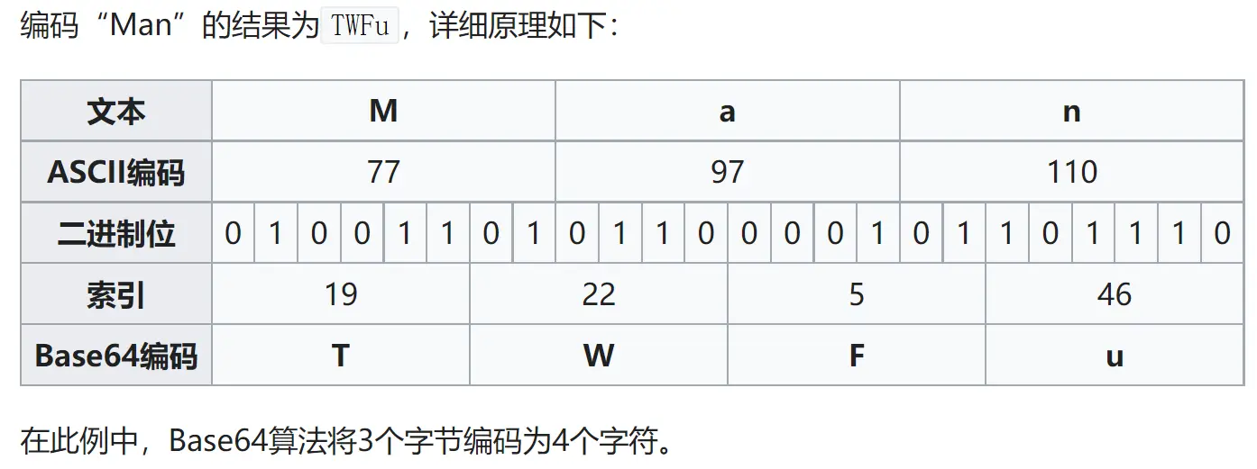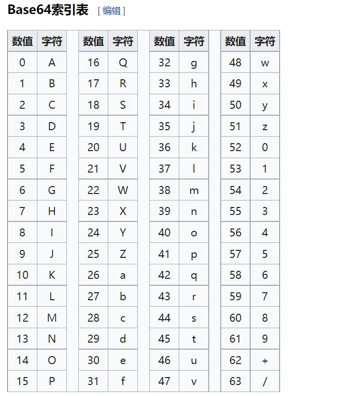 转换的时候,将3字节的数据,先后放入一个24位的缓冲区中,先来的字节占高位。数据不足3字节的话,于缓冲器中剩下的比特用0补足。每次取出6比特,(因为2^6=64}),按照其值选择ABCDEFGHIJKLMNOPQRSTUVWXYZabcdefghijklmnopqrstuvwxyz0123456789+/中的字符作为编码后的输出,直到全部输入数据转换完成。