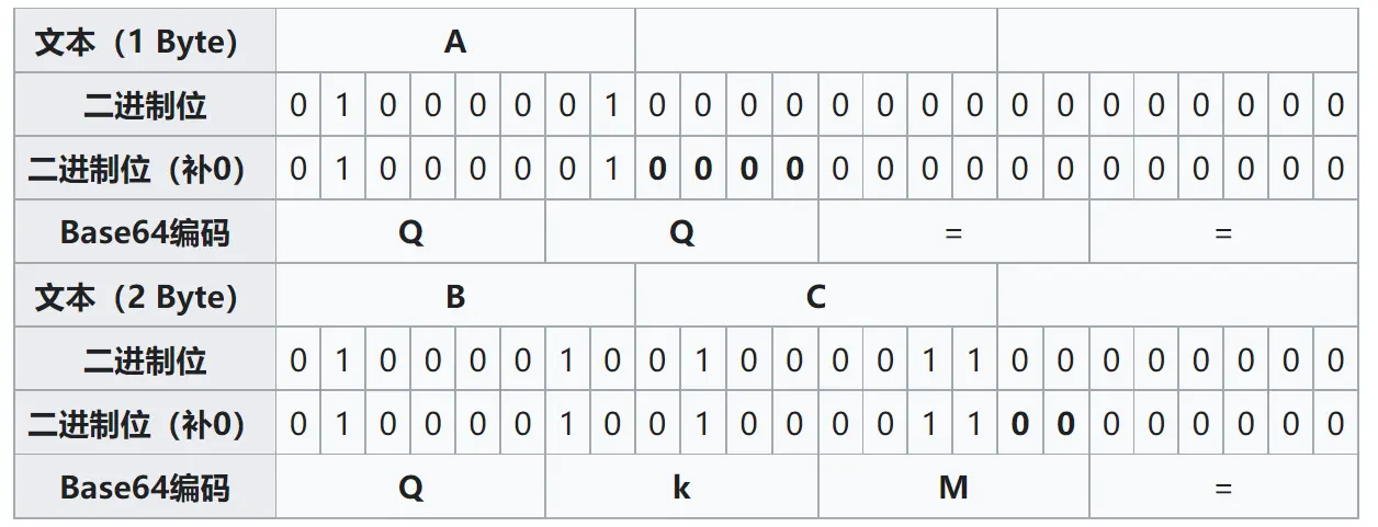 如果要编码的字节数不能被3整除,最后会多出1个或2个字节,那么可以使用下面的方法进行处理:先使用0字节值在末尾补足,使其能够被3整除,然后再进行Base64的编码。在编码后的Base64文本后加上一个或两个=号,代表补足的字节数。也就是说,当最后剩余两个八位(待补足)字节(2个byte)时,最后一个6位的Base64字节块有四位是0值,最后附加上两个等号;如果最后剩余一个八位(待补足)字节(1个byte)时,最后一个6位的base字节块有两位是0值,最后附加一个等号。 参考下表:
