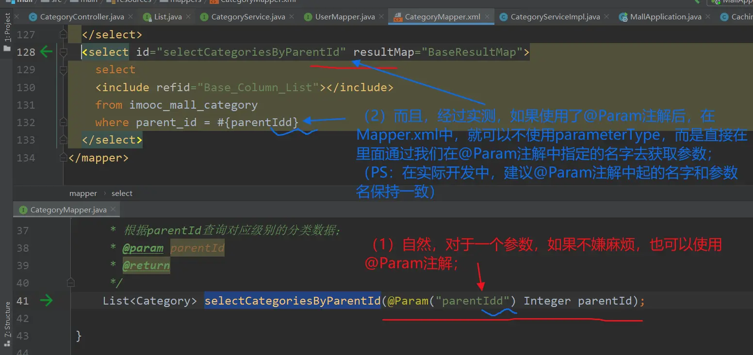 ● 关于使用List接收参数时,是否可以同时使用@Param注解(自己决定是可以的);但是使用了@Param注解后,如何在mapper.xml中获取参数;;关于这一点,自己没有看;;;;(PS:这又不是奥数题,放着更好的策略不采取,为什么看这种比较令人纠结的使用方式嘞?不是自己给自己找麻烦吗~~~)(如果有兴趣,或者需要了,似乎可以参考mybatis集合传参是否用@Param注解的区别)