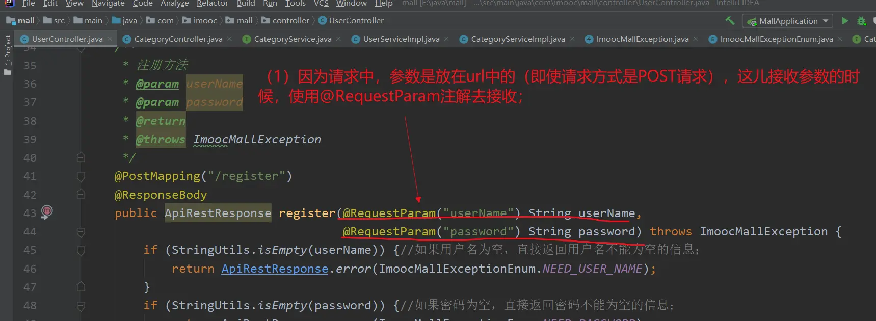 目前来看这儿的逻辑是(起码目前可以这样看): 【get请求,参数是放在url中,而且经常出现如user_name这样的名字;为了能以userName的方式接收到这个参数;我们就使用了@RequestParam注解】→【然后,@RequestParam注解可以推广开来;凡是参数是在url中的请求,都可以使用@RequestParam注解去接收】→【于是,即使对于POST请求,如果参数在url中,也可以使用@RequestParam注解】→【其实,如果参数名和接口中的参数名写对,即使不用@RequestParam注解,也是能接收到参数的;也就是说,@RequestParam注解可以看成是一种保险】;