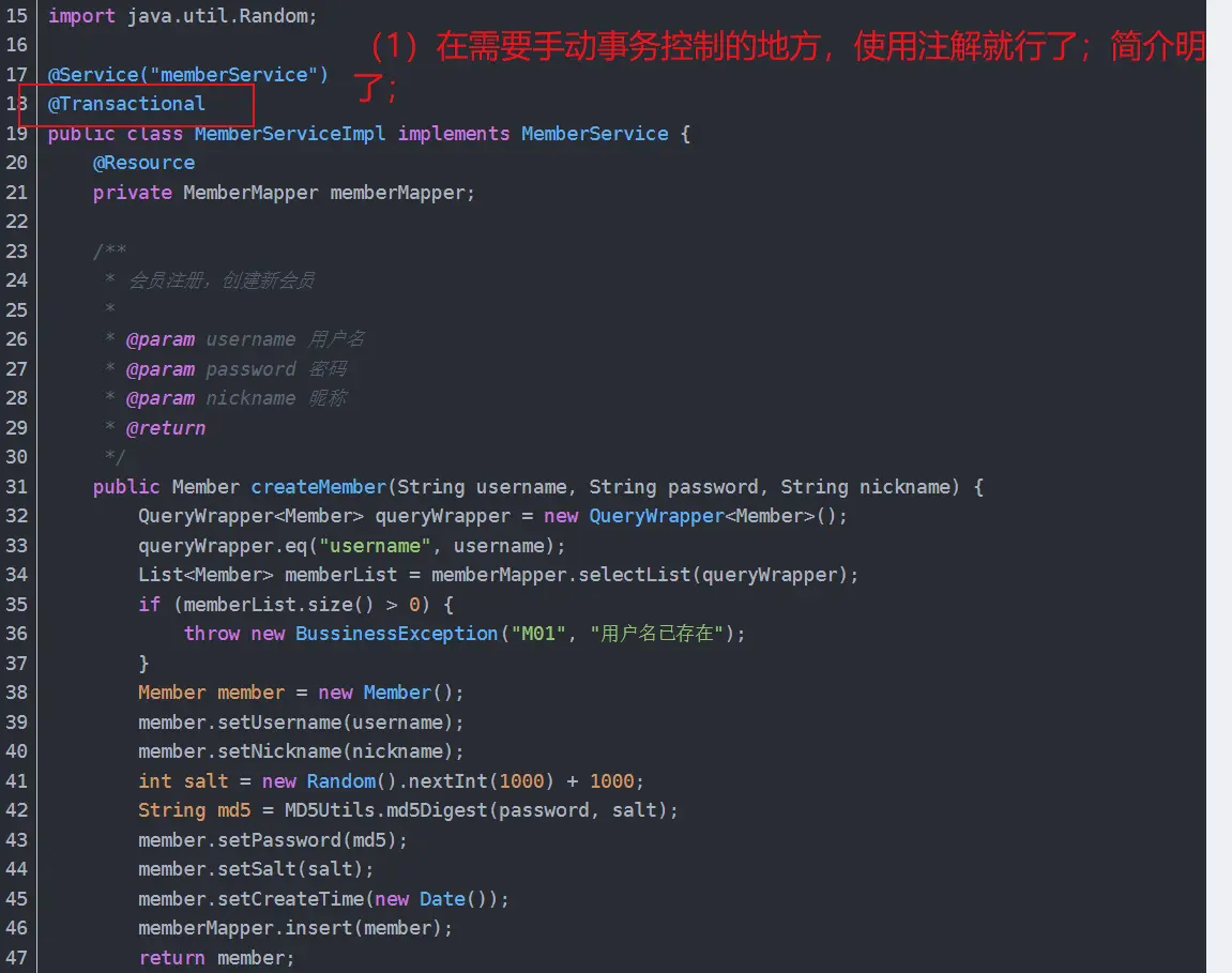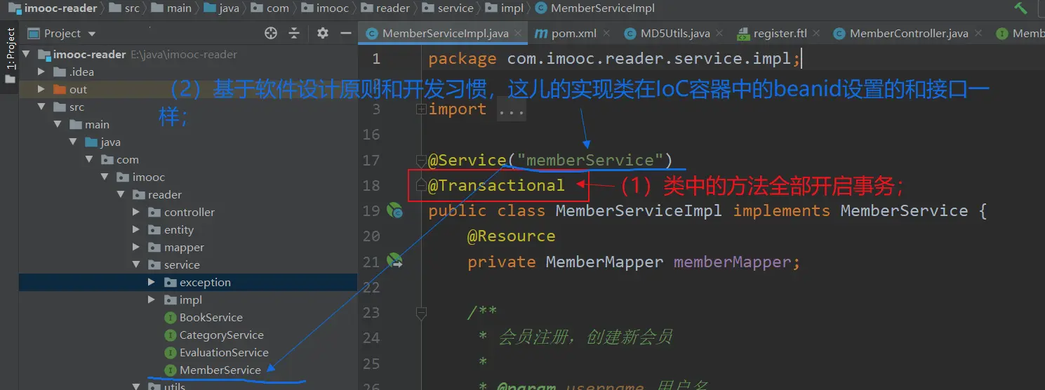 ● 然后,声明式事务在程序中的使用案例,可以参考【SSM开发书评网11:图书列表分页及查询一:显示图书类别;(本篇博客是【SSM+Mybatis-Plus】的第一次标准流程演示)】和【SSM开发书评网21:完成会员注册功能;(本篇博客包含了【开启事务、自定义异常、MD5加盐混淆、util.Date和sql.Date】等大量前面介绍过的知识)】等;主要就是,在Service层上使用@Transactional注解;然后,根据该Service中的方法究竟需不需要开启手动控制事务,进行相应的设置;