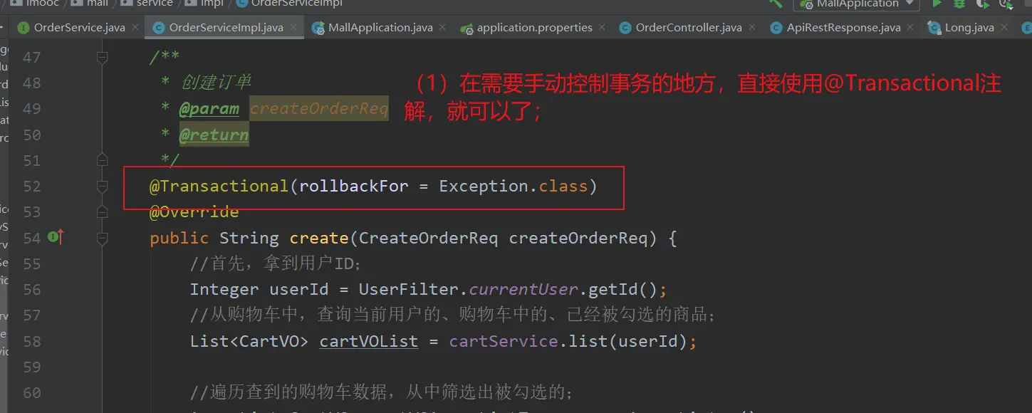 ● 在【Spring Boot电商项目53:订单模块二:【前台:创建订单】接口;】开发创建订单功能时候,要实现这个功能,在底层就需要有多个增删改的语句,为了保证业务要么全部成功要么什么也不错的要求,就需要我们手动控制事务;