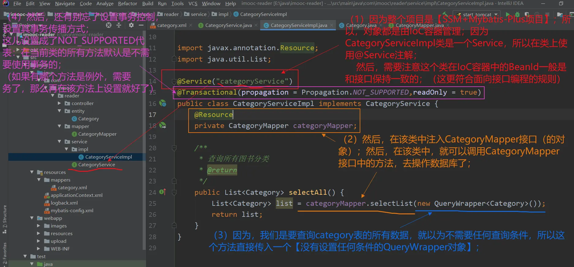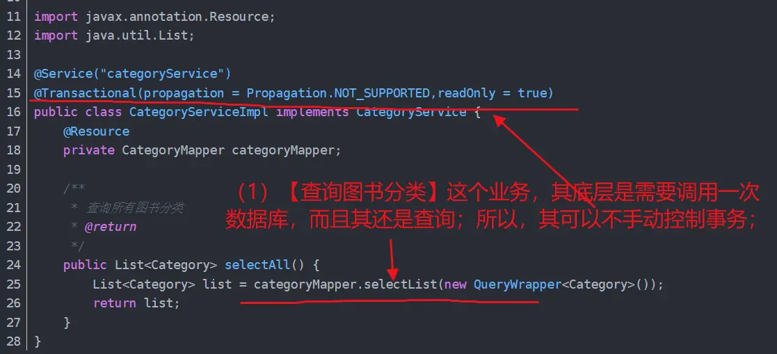 ● 【SSM开发书评网11:图书列表分页及查询一:显示图书类别;】:显示图书类别功能,因为其底层只需要执行一条SQL,而且其还是查询,所以可以不手动控制事务;